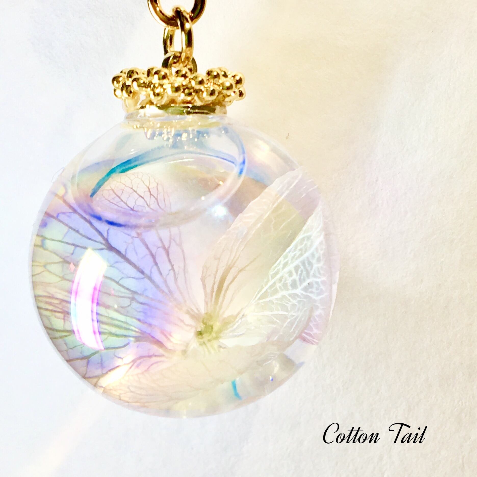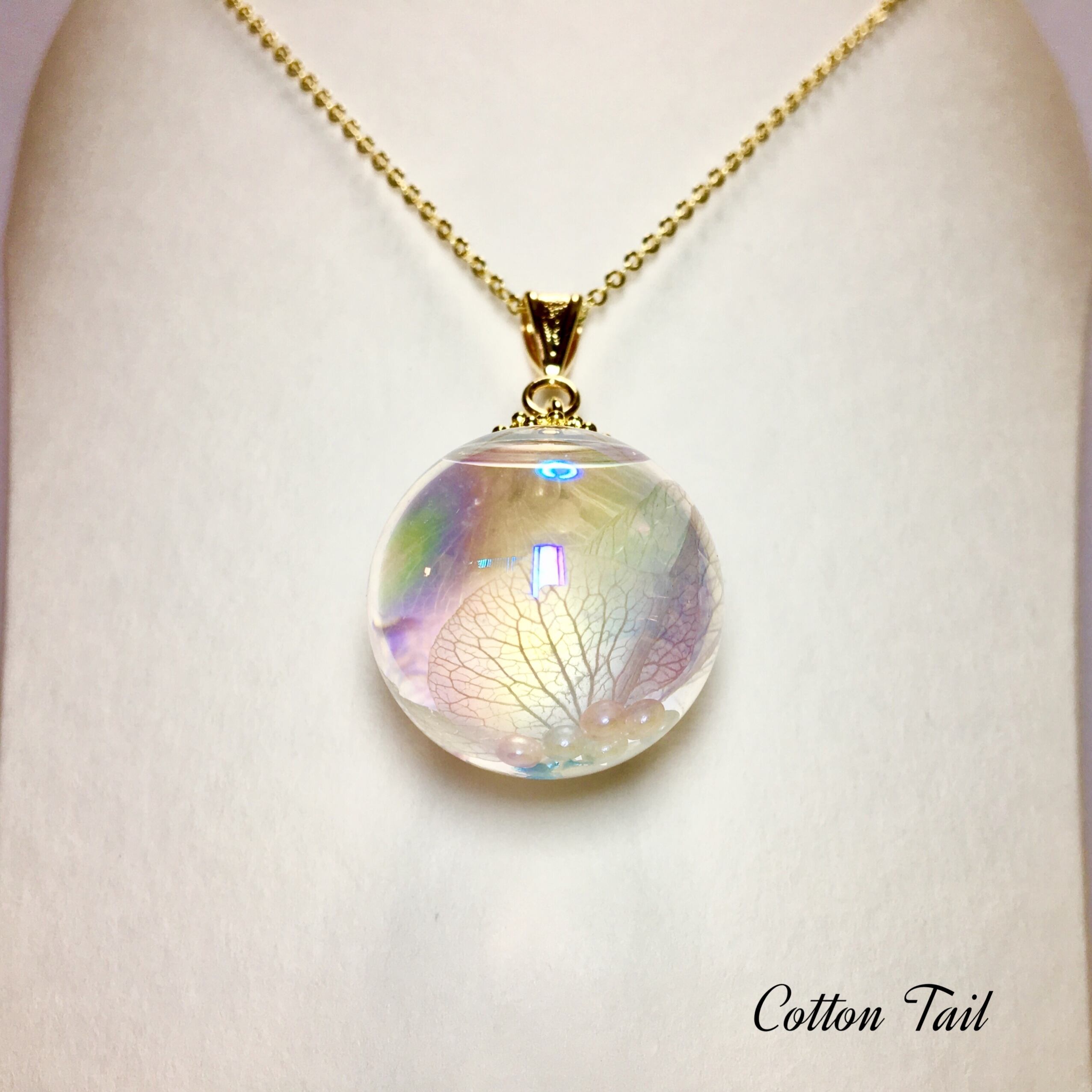 28mmのシャボン玉加工されたガラスドームにピンクからブルーのグラデーションの紫陽花の花や穴なしパール、ブルーのガラスカレットなどを入れたハーバリウムオイルを入れ、ハーバリウムネックレスにしてみました。
