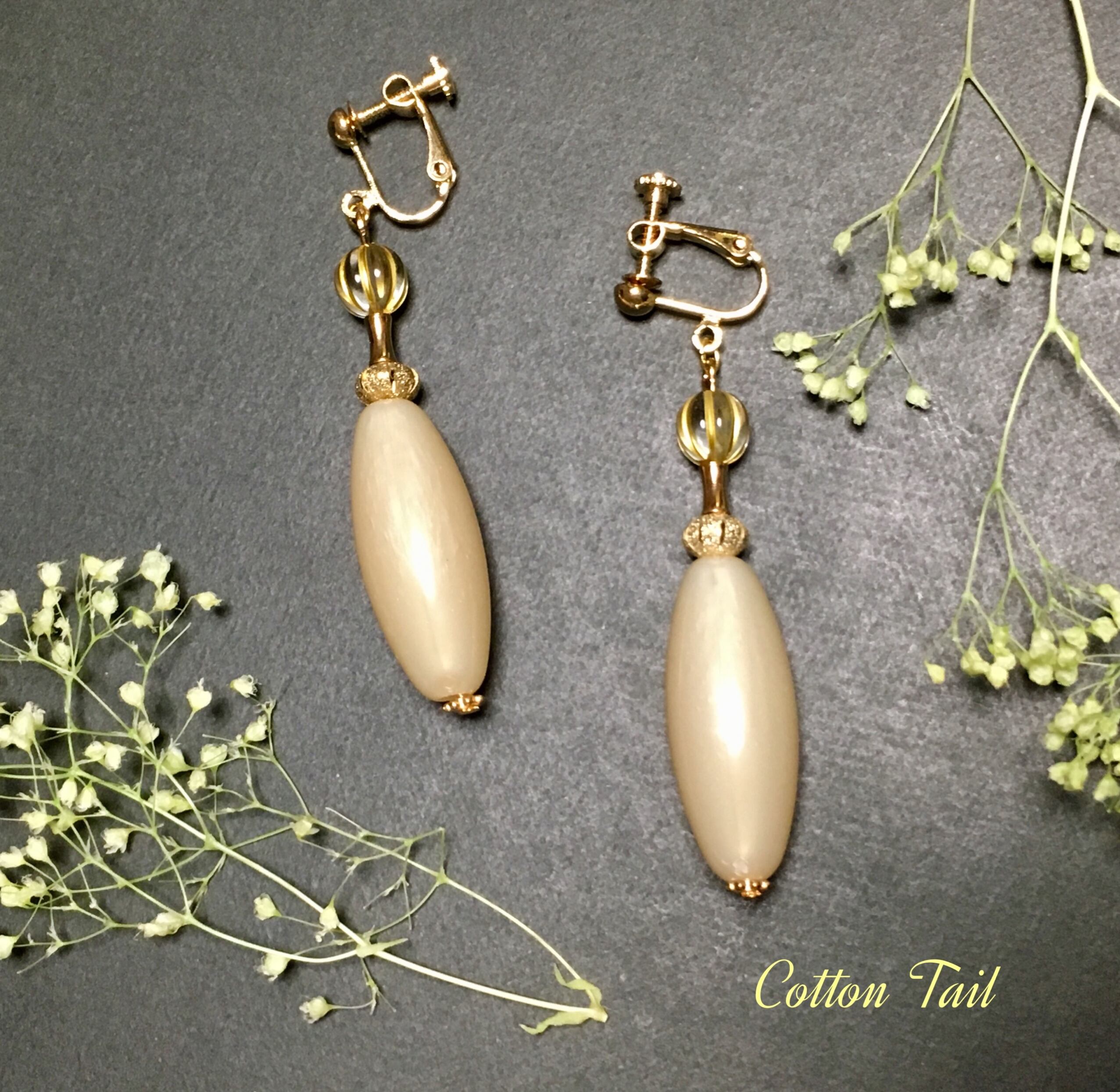 とても華やぎのあるビビッドピンクとビビッドグリーンを組み合わせたイヤリングと、クリームカラーのロングビーズと金線入りビーズを組み合わせたイヤリングです。