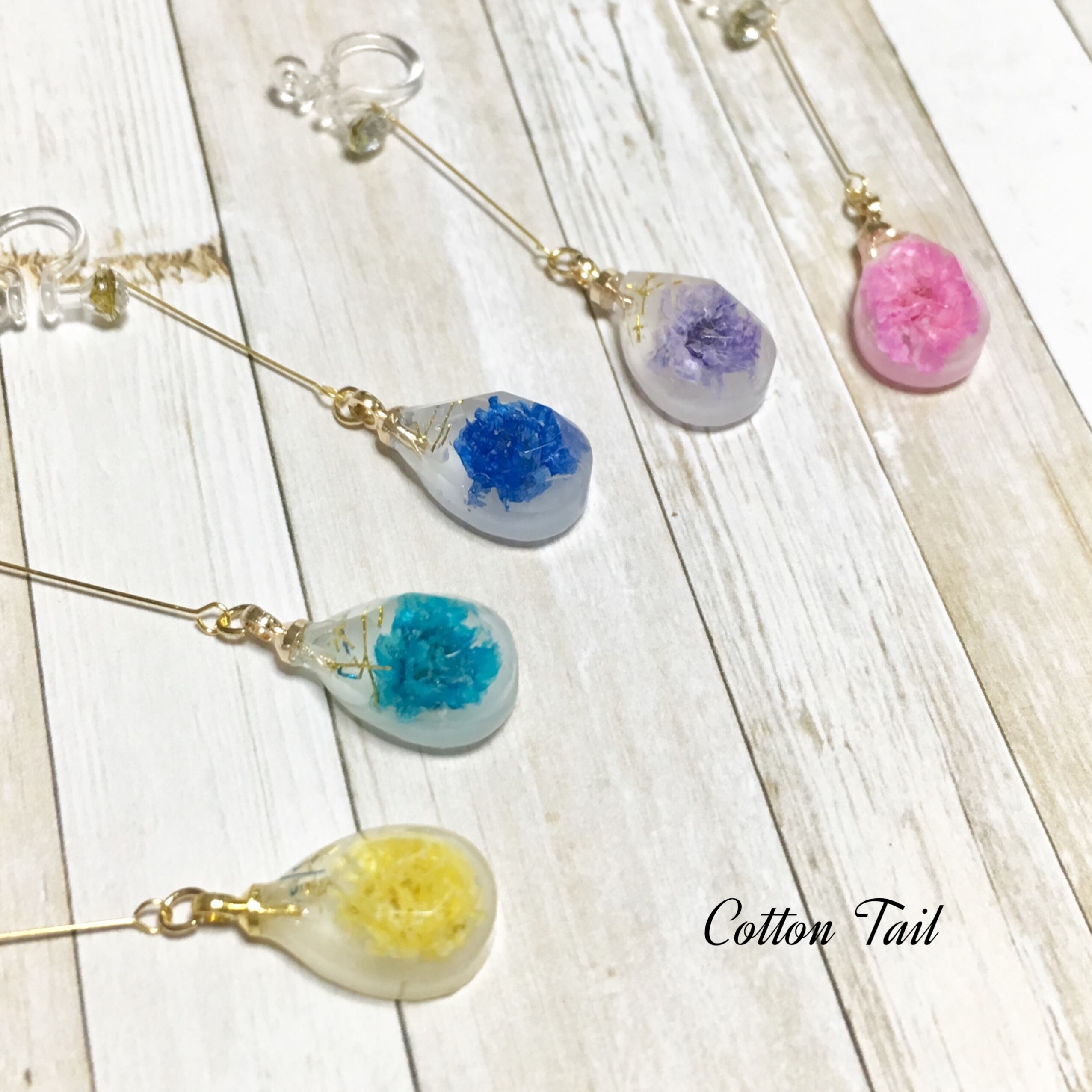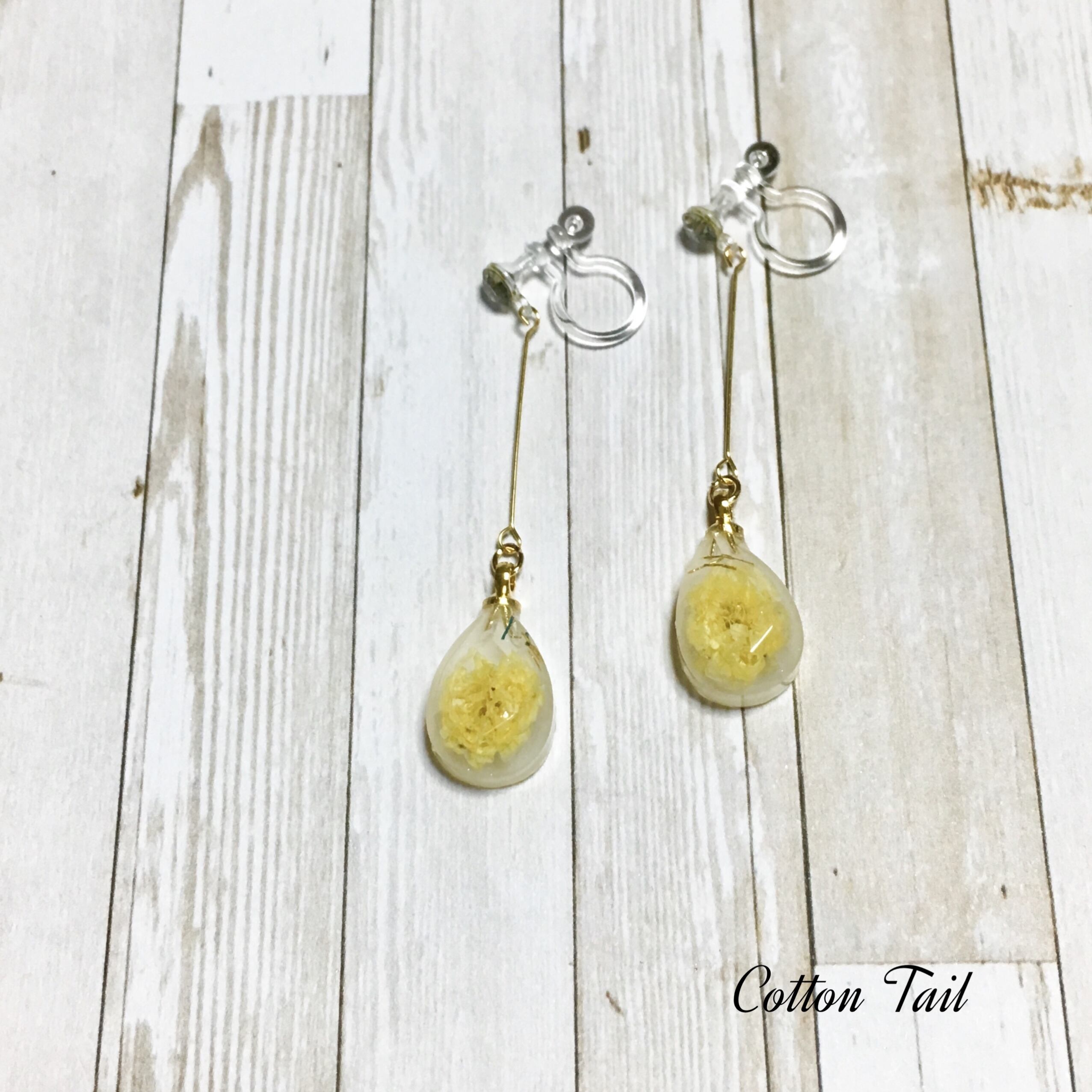 大粒のかすみ草を一輪、ドロップ型に入れ2.5cmの9ピン(ピアノ線)でつなぎイヤリング(ピアス)にしました。