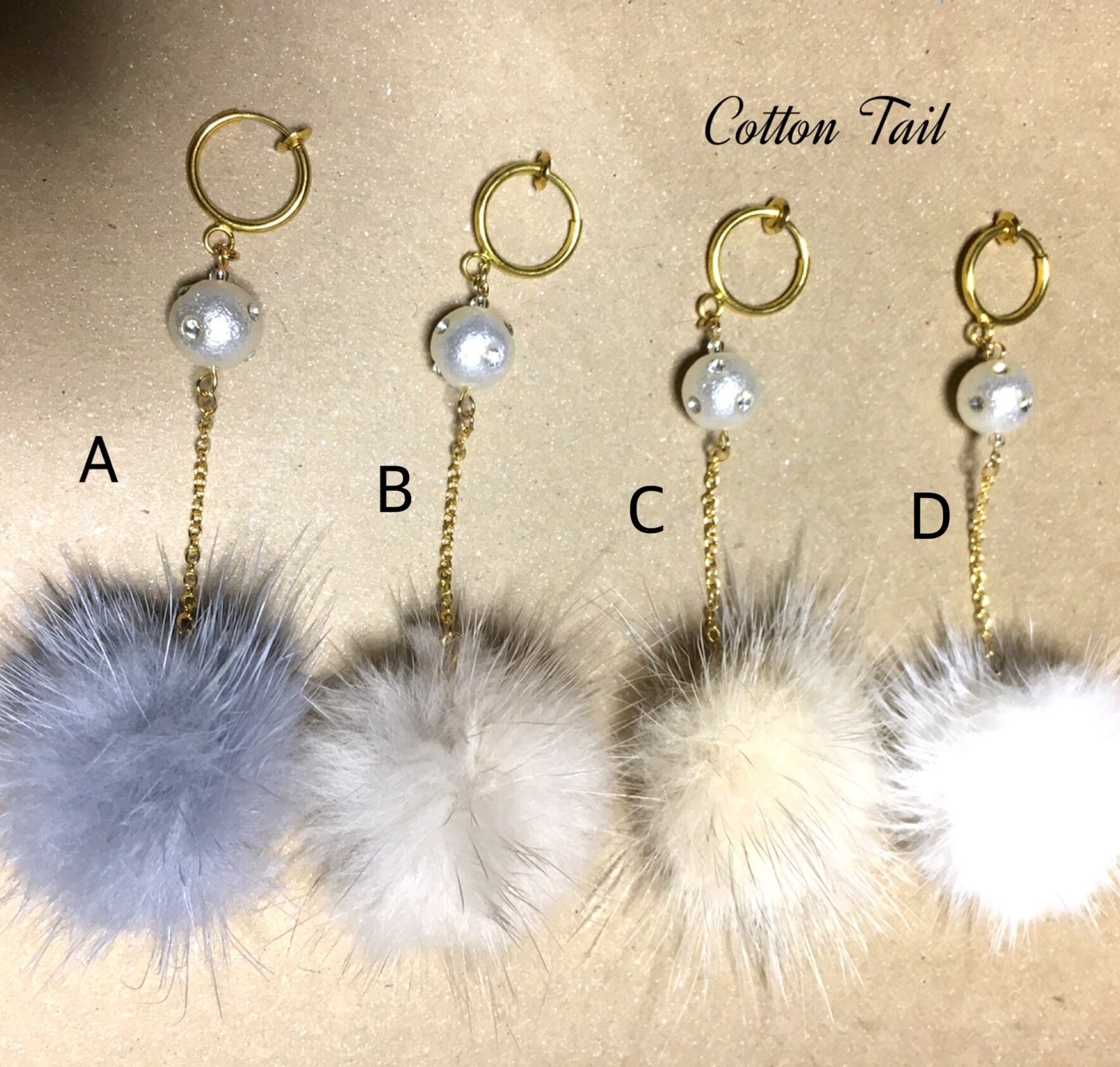 3個のミンクファーを使いファーボールにしたものとビジュー付きパール調ビーズと組み合わせた片側ともう一方は、水色(光の加減でパープルに変化します)の雫ガラスとビジュー付きパール調ビーズとを組み合わせた、アシンメトリのイヤリングです。
