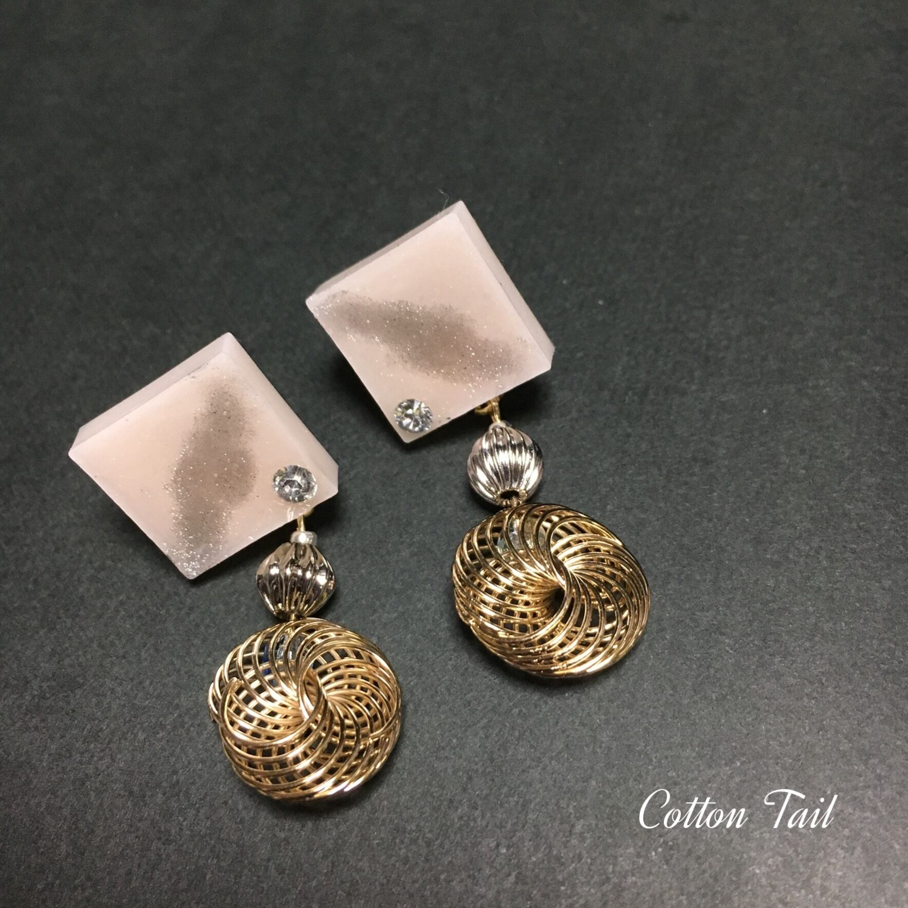 金銀模様入り四角プレートのイヤリング(ワイヤーデザインチャーム付き)