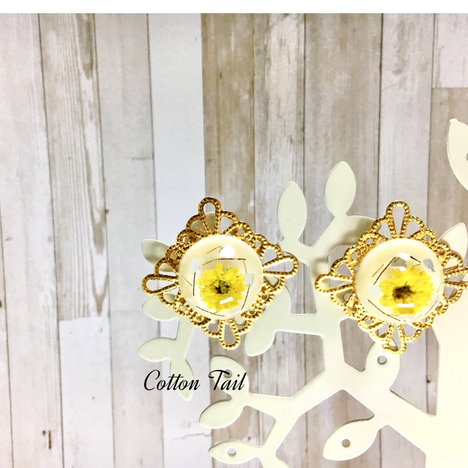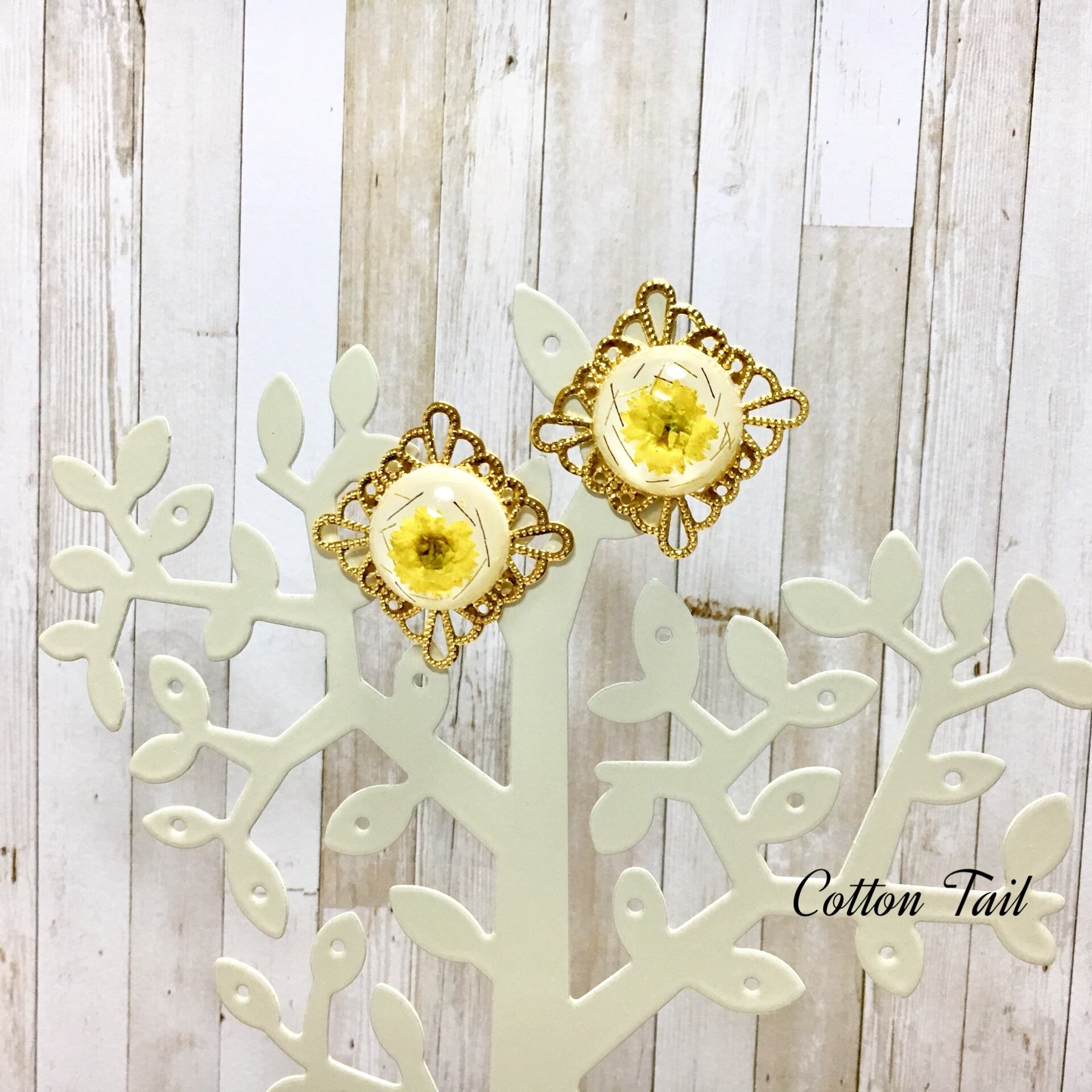 黄色のドライフラワーを封入した半球を透かしスクエアプレートと組み合わせてイヤリングに仕上げました。