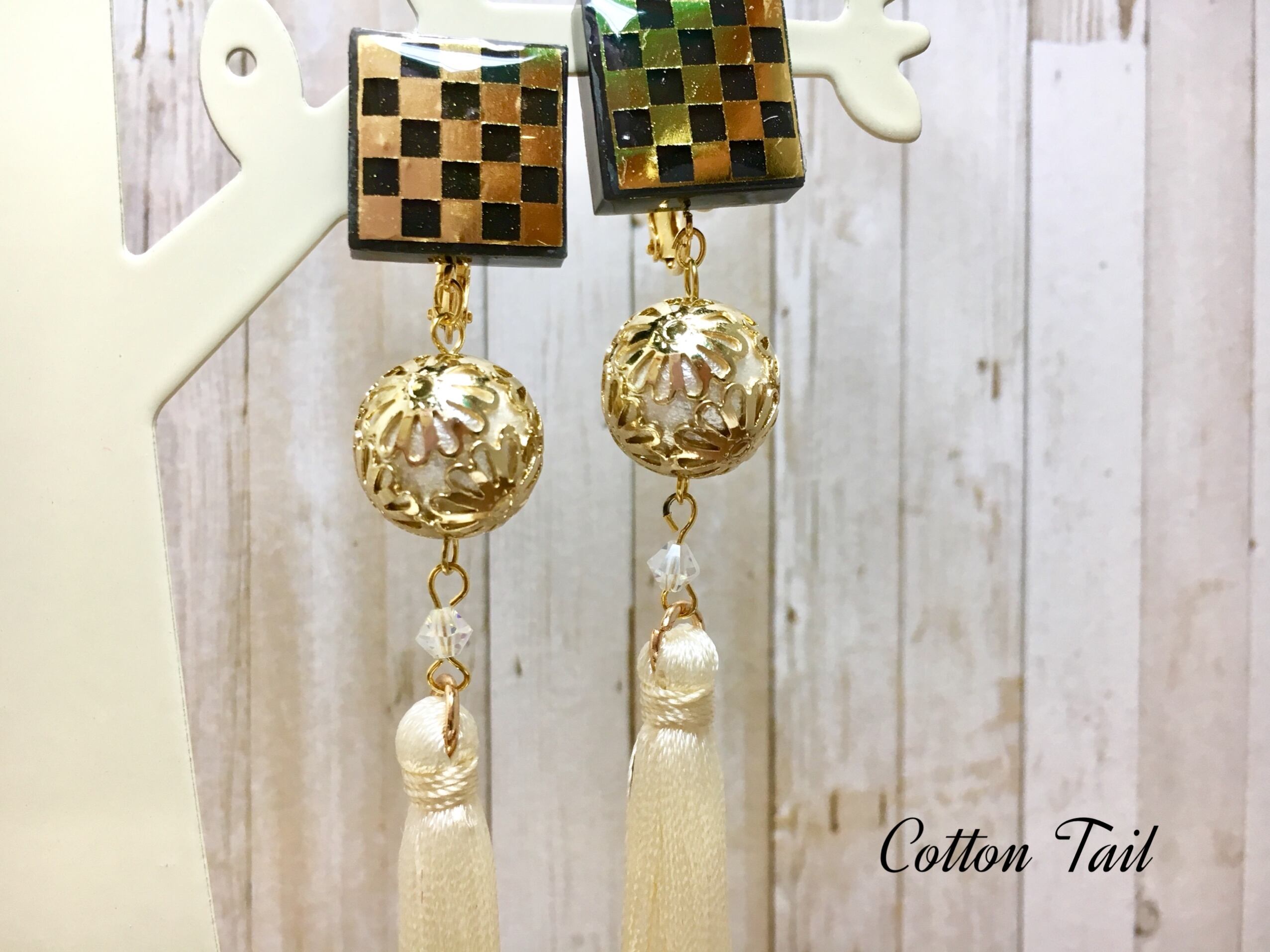 タッセルも和柄似合うものを使用し、コットンパールとタッセルの間にスワロフスキーを配し、上品かつ華やかなものになっております。