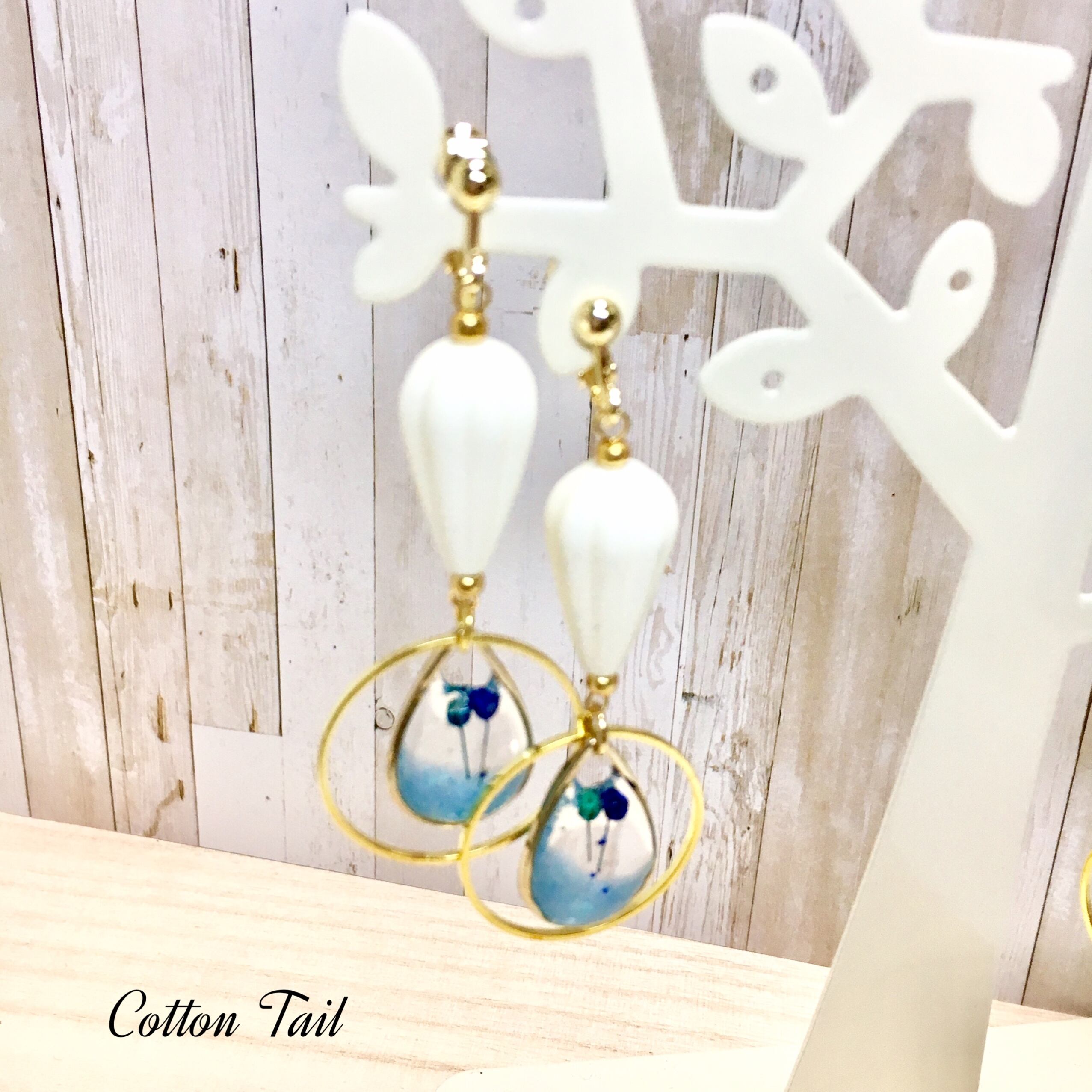 雫型の中にかすみ草を閉じ込めたイヤリングです。