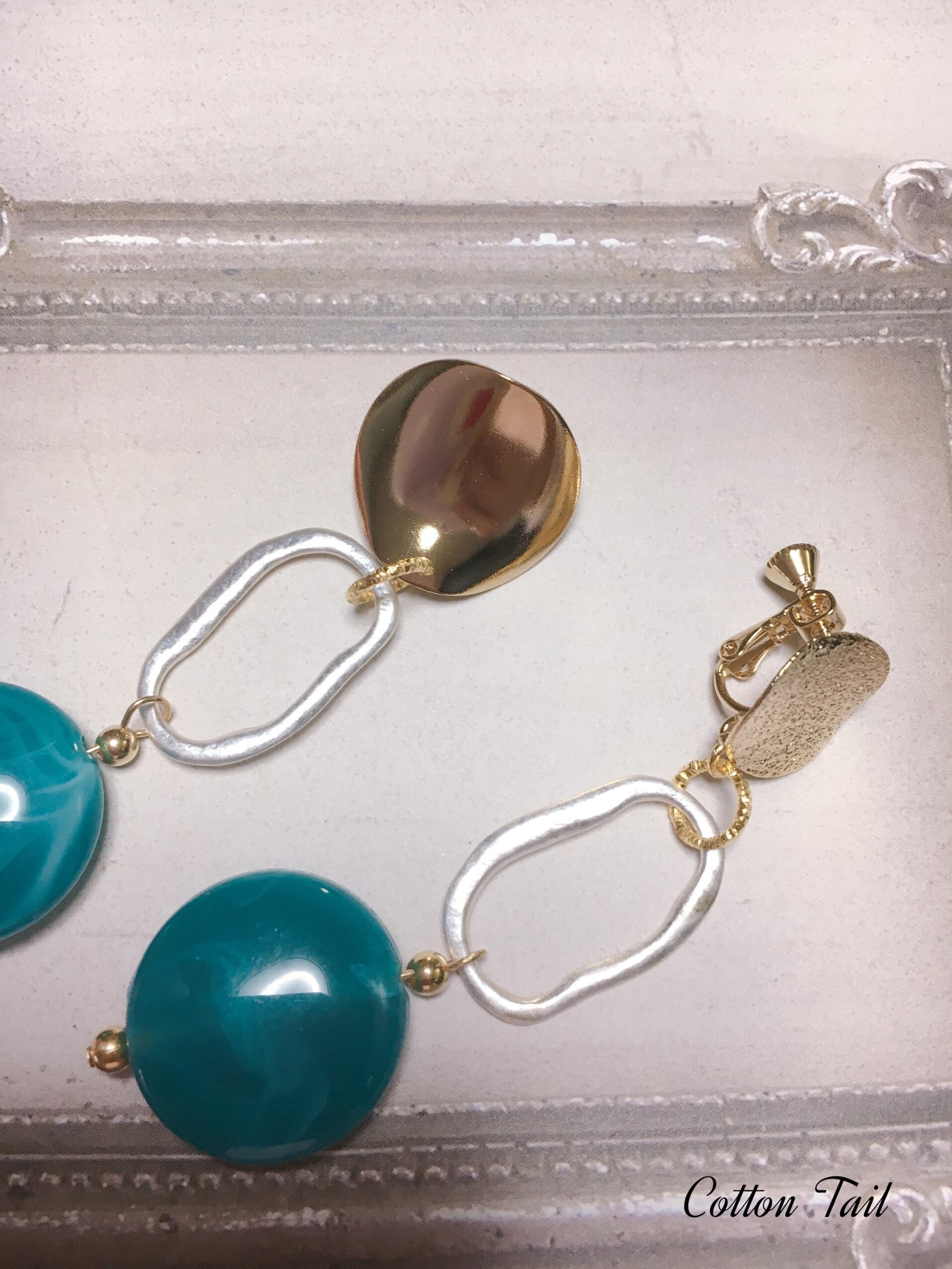 とても綺麗なイヤリングパーツに大ぶりボタンビーズとシルバーリングを組み合わせたものです。