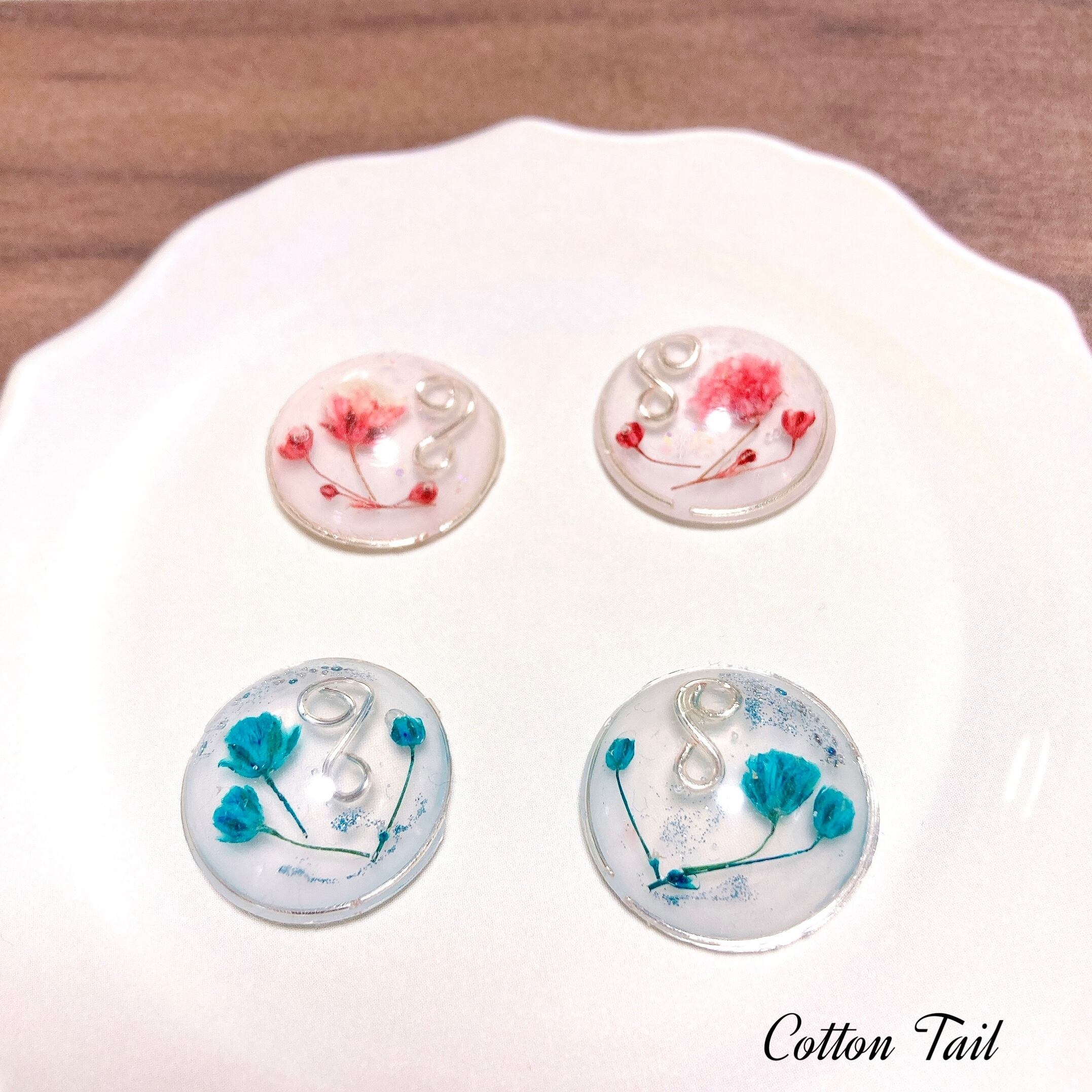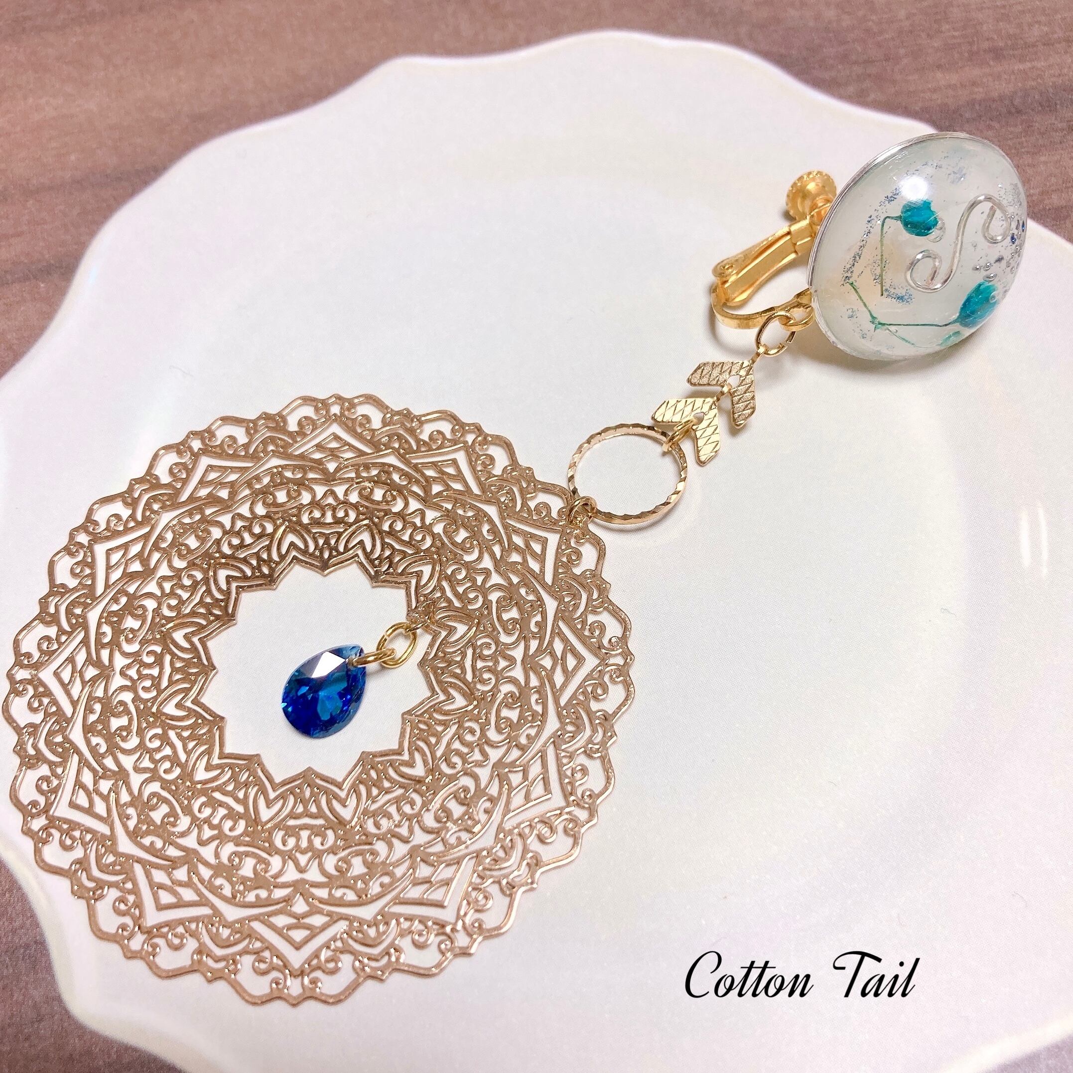 コチラの作品は、耳元にワイヤーと青い霞草・ブリオンなどを散りばめ20mmの半円形にレジンで作り貼り付けたものと50mmの透かしプレートとキュービックジルコニアを合わせたイヤリングです。