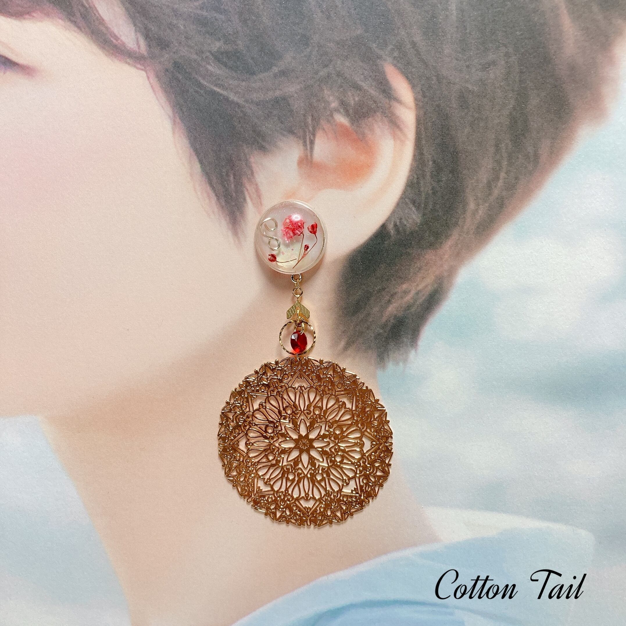 コチラの作品は、耳元にワイヤーと霞草・ブリオンなどを散りばめ20mmの半円形にレジンで作り貼り付けたものと50mmの透かしプレートとキュービックジルコニアを合わせたイヤリングです。