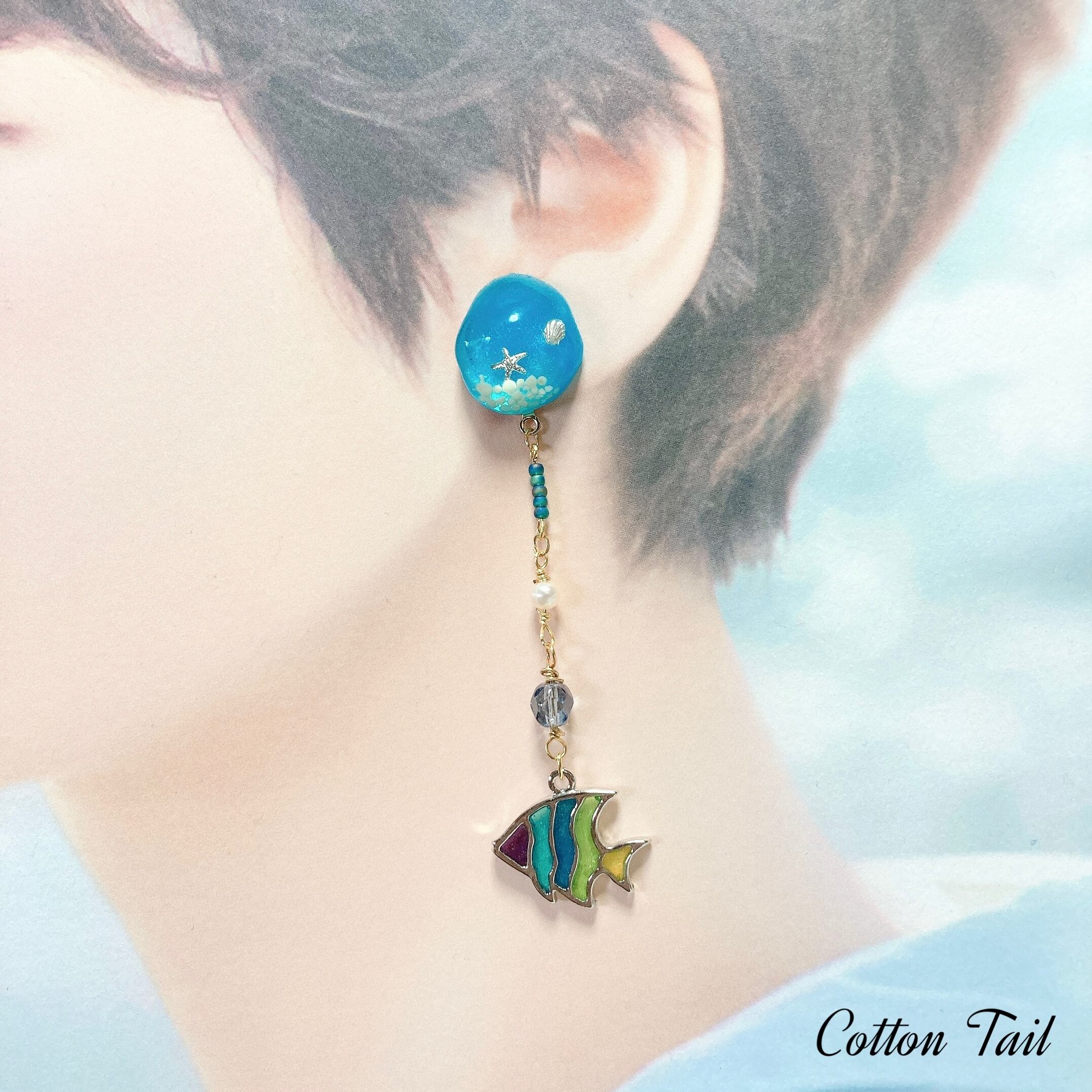 こちらの作品は、耳元に海をレジンや星の砂・ヒトデ・貝殻で表現したものと、爽やかな夏色に着色したエンゼルフィッシュとワイヤーで繋いだ淡水パール、チェコビーズと丸小ビーズを組み合わせてイヤリングにしました。