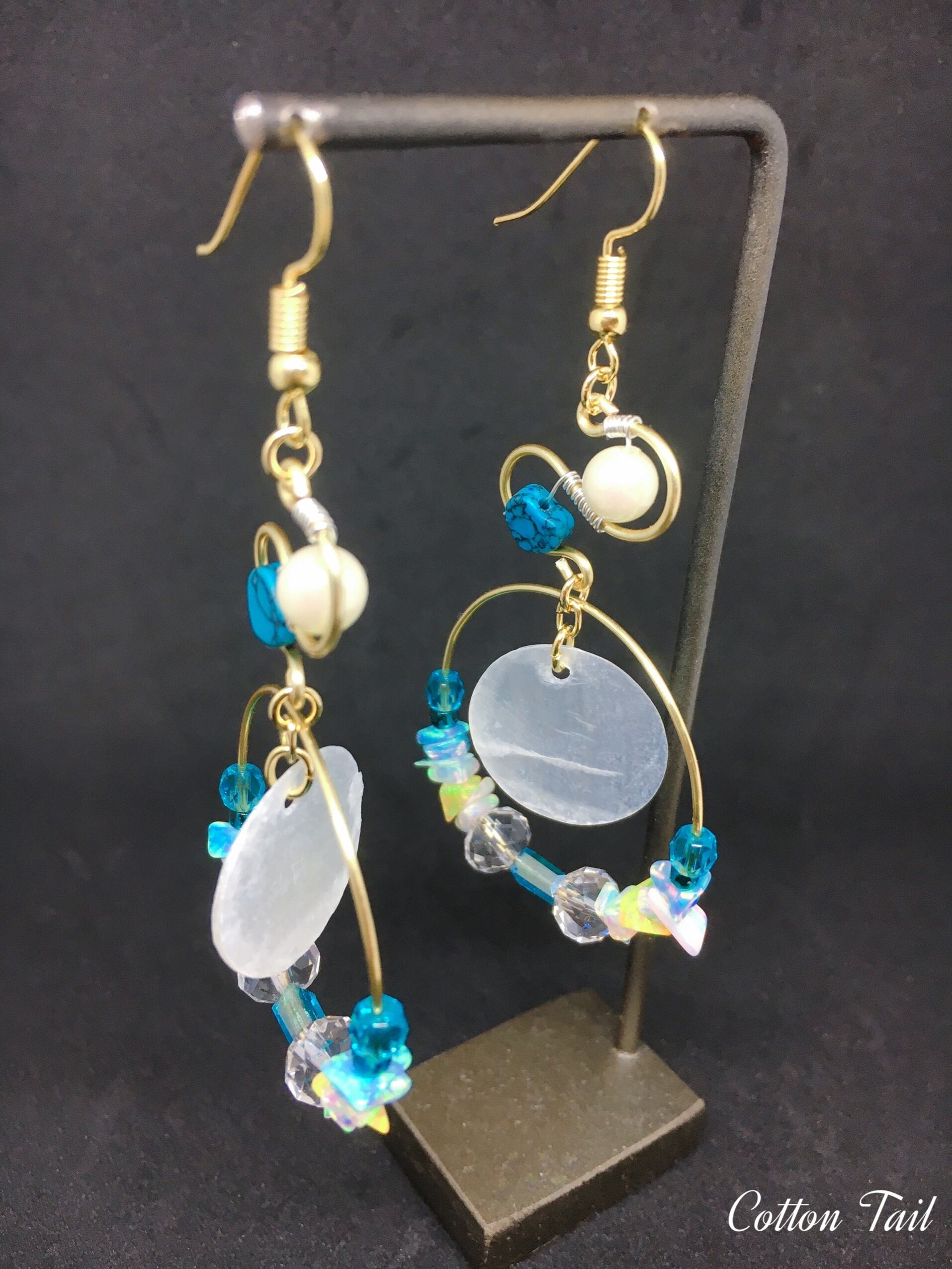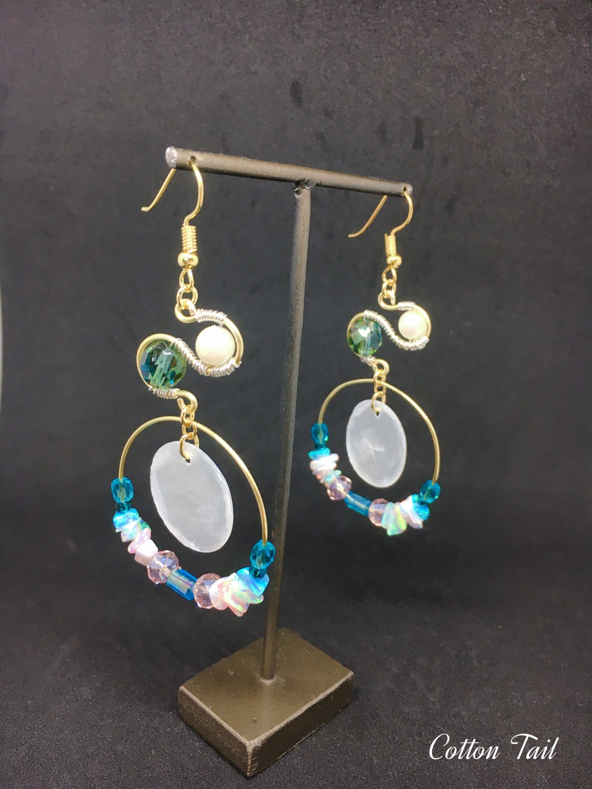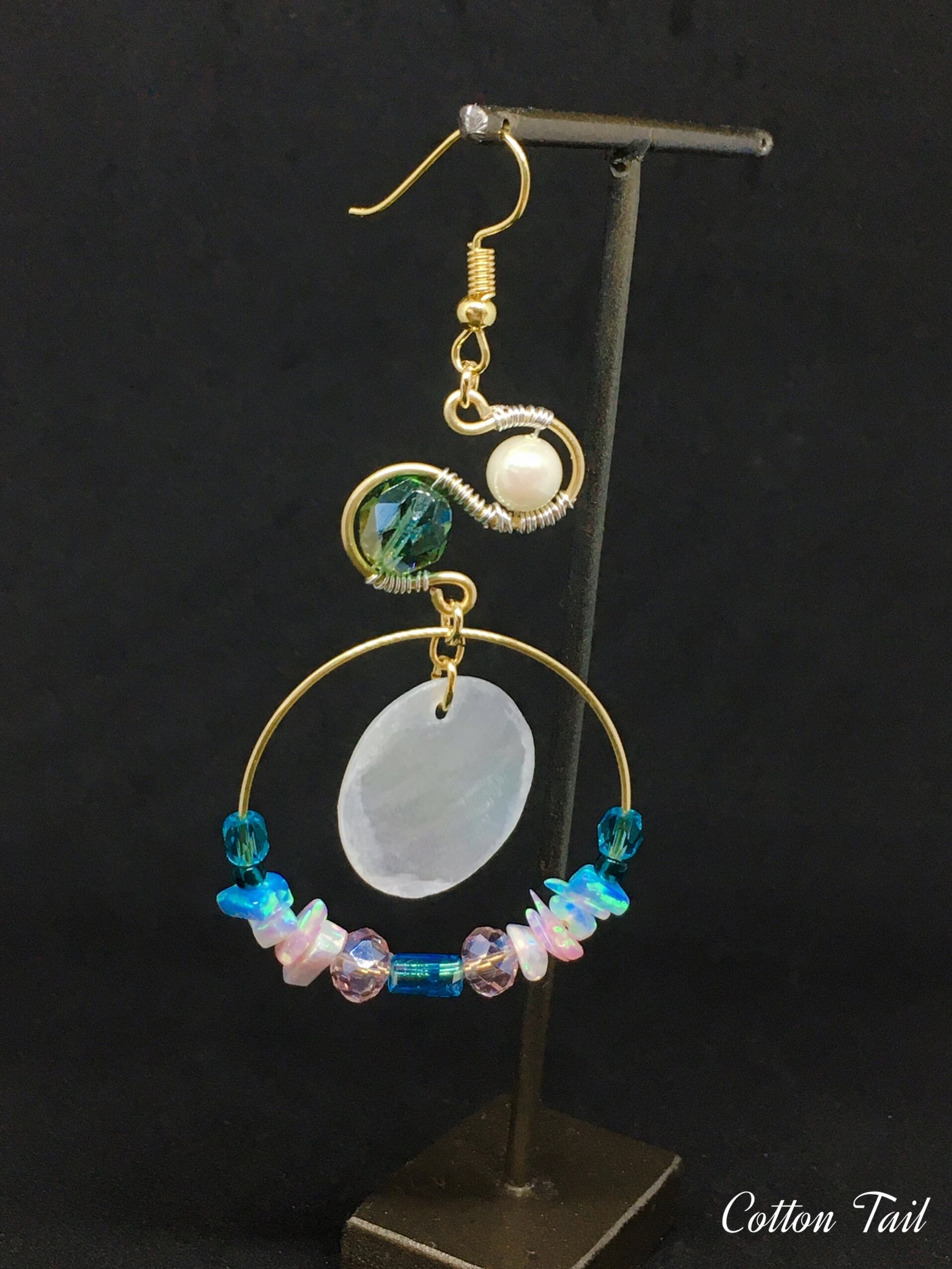 ワイヤーで作ったリングにチェコビーズや人工オパール(ホワイト、ブルー、イエロー、ピンクなど)、デリカビーズなどを通し形づけたものとシェルラウンドプレートを組み合わせました。