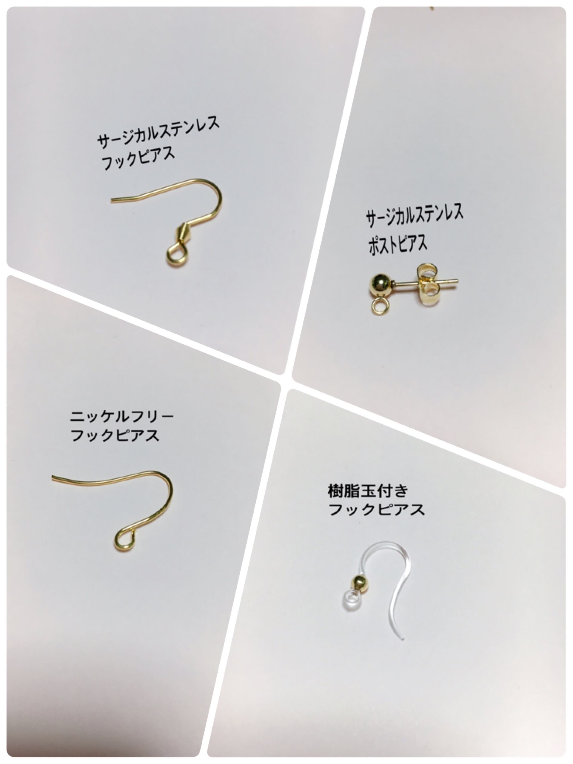 イヤリング・ピアス金具は、基本パーツのバネネジイヤリングとフックピアスとなります。