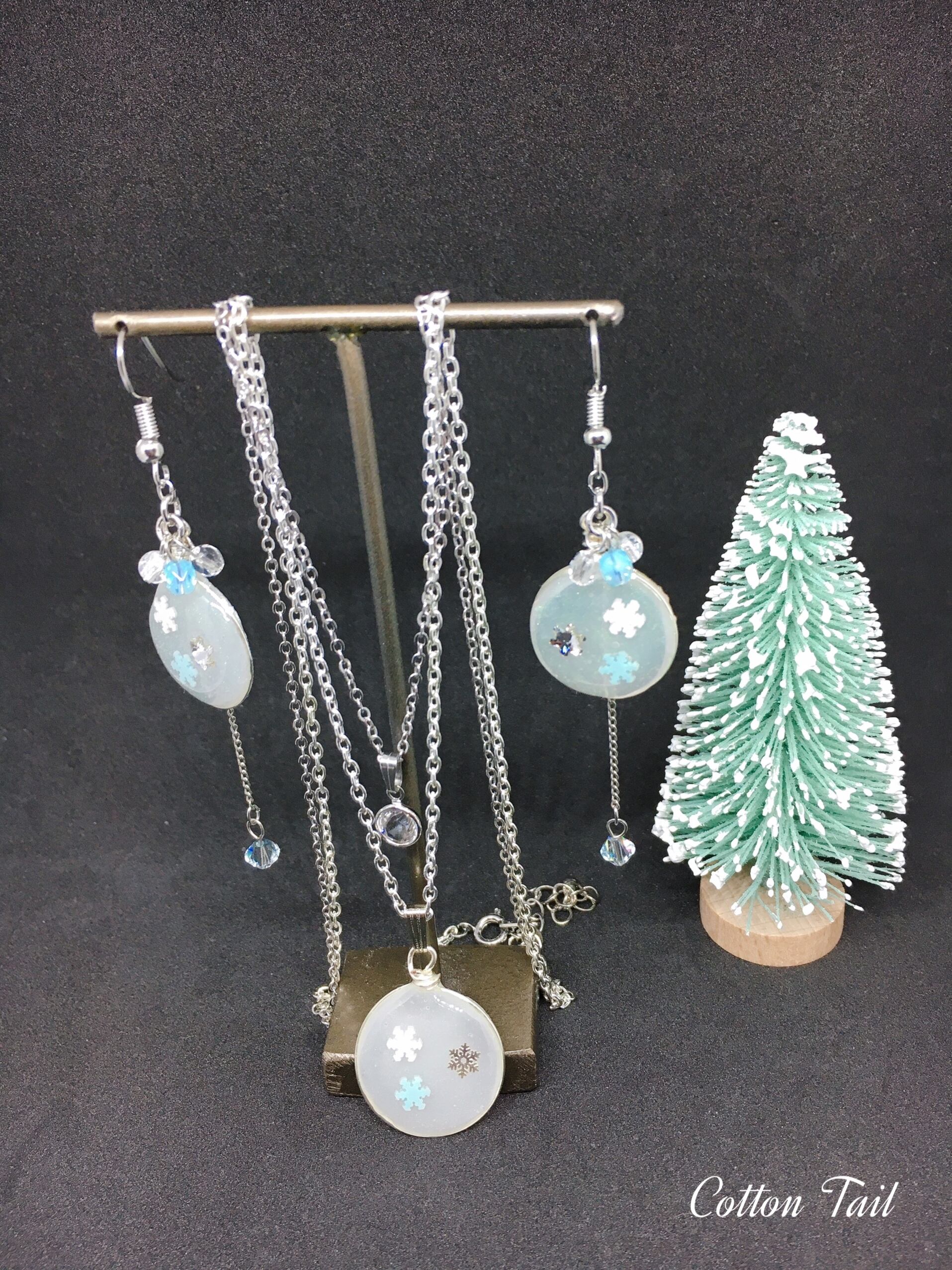 こちらは、アーティスティックワイヤーを使用し、レジンと雪の結晶フレーク、スワロフスキー(雪の結晶貼り付け)などで雪の結晶イヤリングとネックレスを作ってみました。