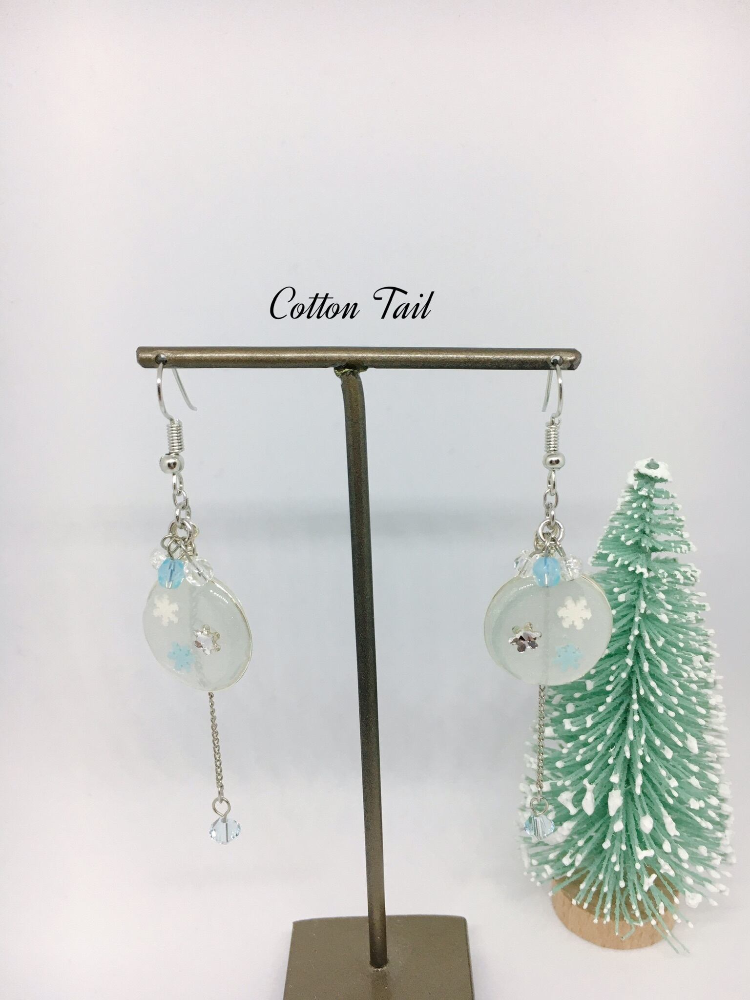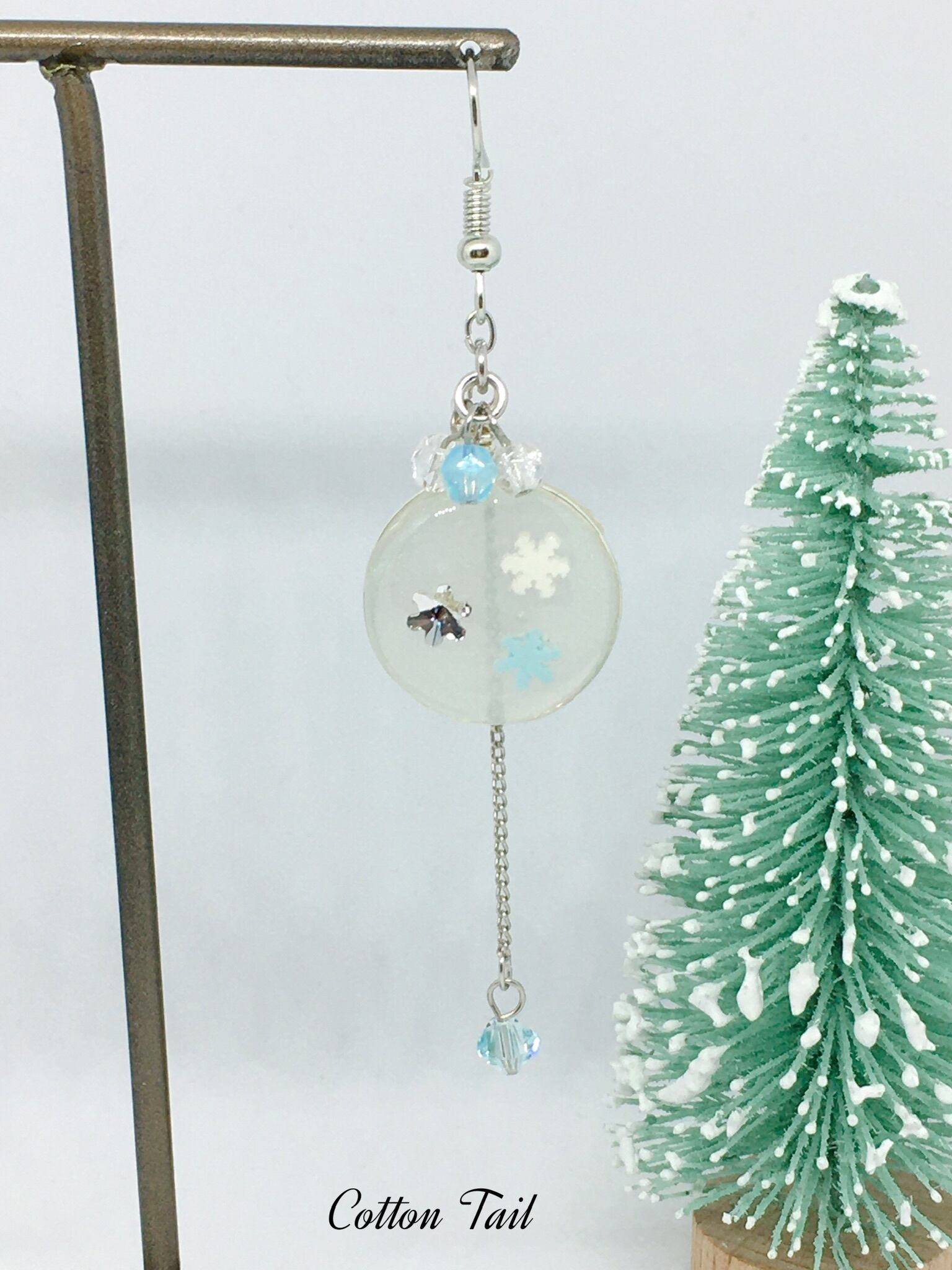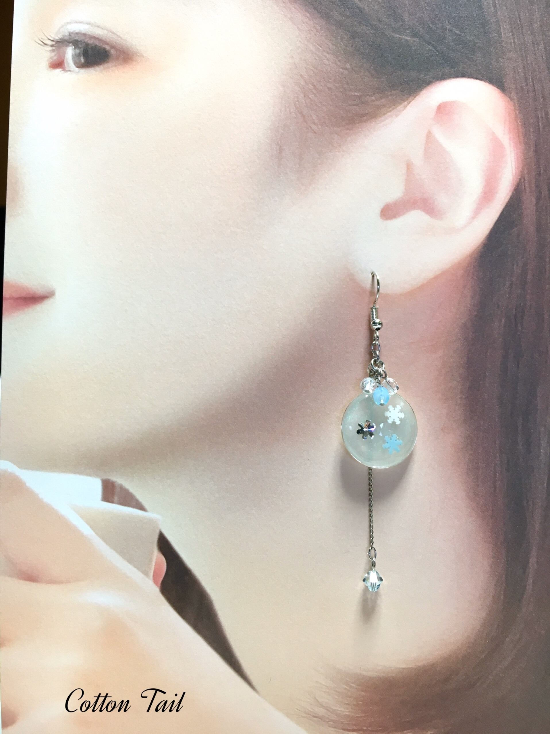 こちらは、アーティスティックワイヤーを使用し、レジンと雪の結晶フレーク、スワロフスキー(雪の結晶貼り付け)などで雪の結晶イヤリングを作りました。
