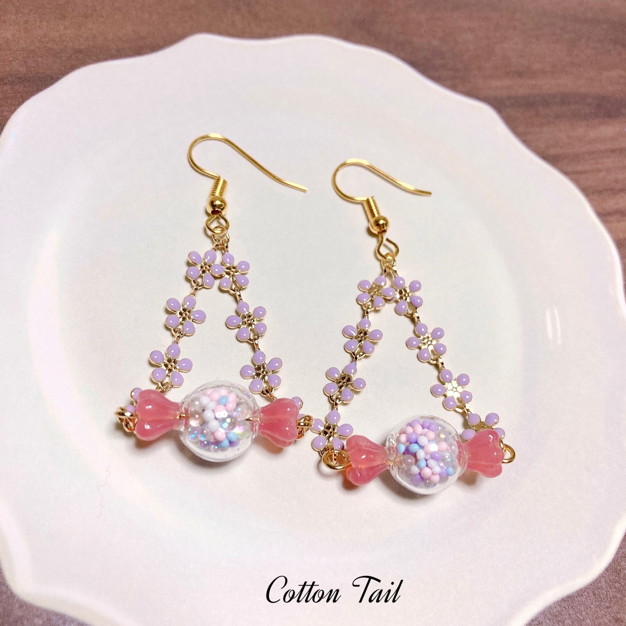 コチラの作品は、8mmのガラスドームとチェコビーズ、フラワーチェーンで作った可愛いキャンディピアスです。