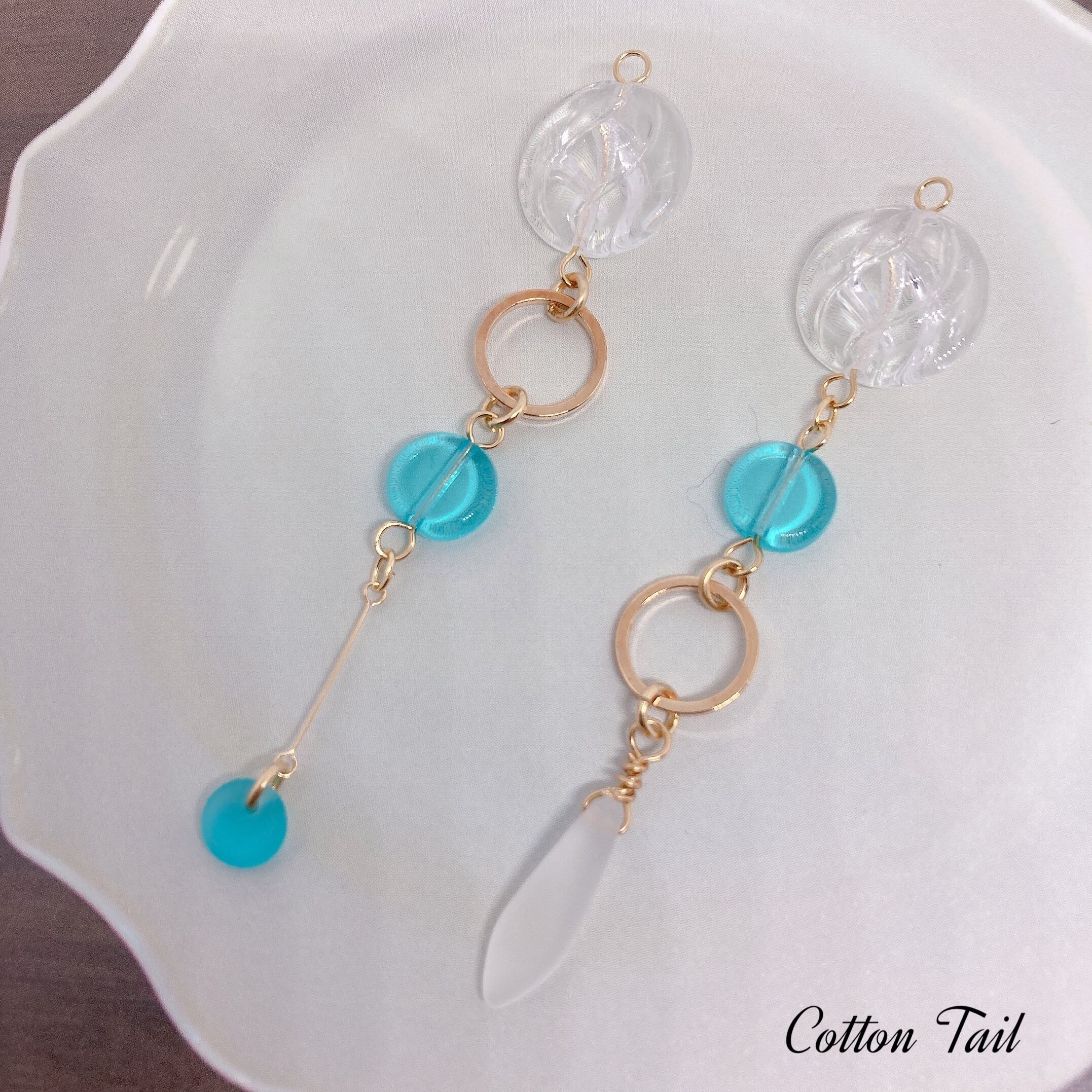 透明のデザインディスクビーズ(14mm)が氷のような感じを醸し出しているところにタイムビーズと呼ばれる8mmビーズ(アクアマリン)を付けたものの一方に6mmレンズビーズ(マットアクアマリンAB)を付け、もう一方にクリスタルマットのダガービーズ16×5mmを付け、デザインに変化をつけたピアスに仕上げました。