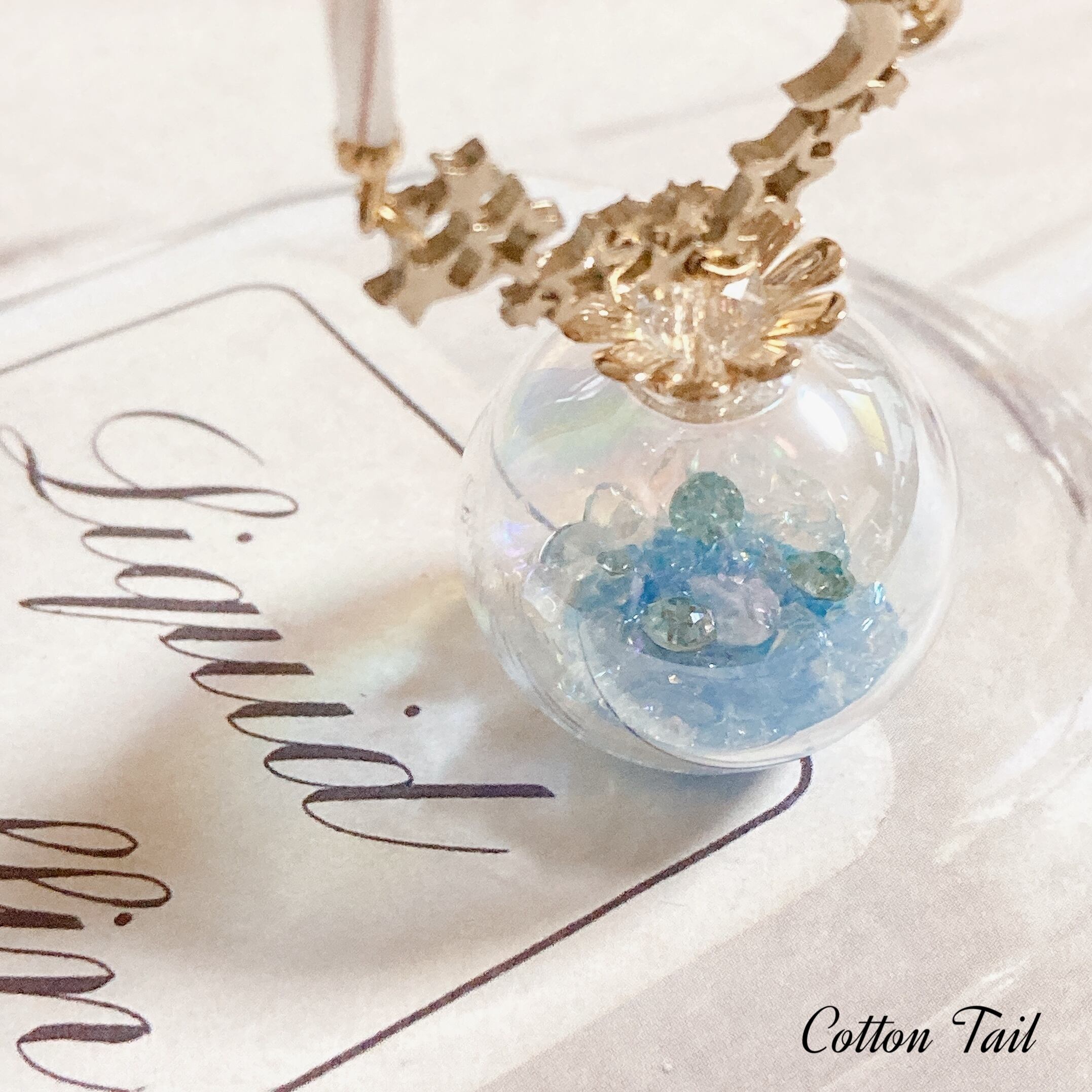 こちらは、オーロラ加工された30mmガラスドームにキラキラ光る鉱石をイメージしてオーロラガラスやブルーのダイヤカットガラスなどを閉じ込めたものをネックレストップにし、夜空チャーム・デザインメタルビーズ・チェコビーズ(金線ねじれパイプビーズ8mm)を使用したネックレスです。