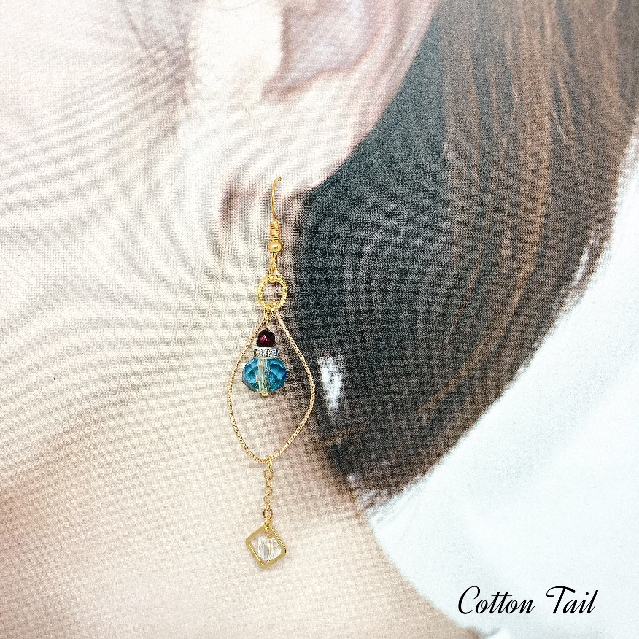 こちらは、青いグラデーションのガラスビーズとロンデルやチェコビーズを可愛い香水瓶に見立てたものと、変形フープを組み合わせたイヤリングです。