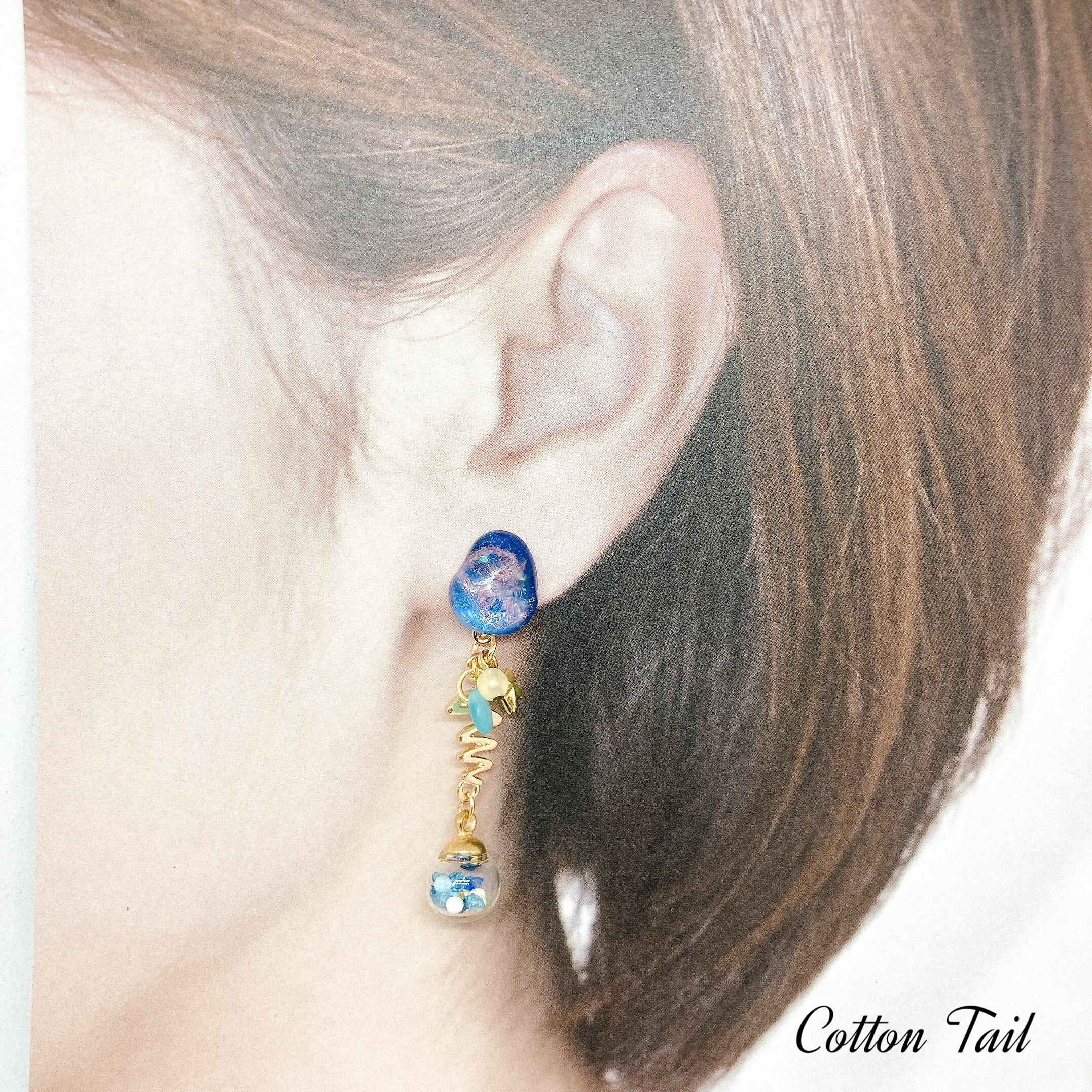 こちらは、レジンにて宇宙っぽい感じを出したカボションを作り出した所から連想したキラキラの星が落ちてきてイヤリングに宿ったらという発送でガラスドームの中に蓄光石を入れております。