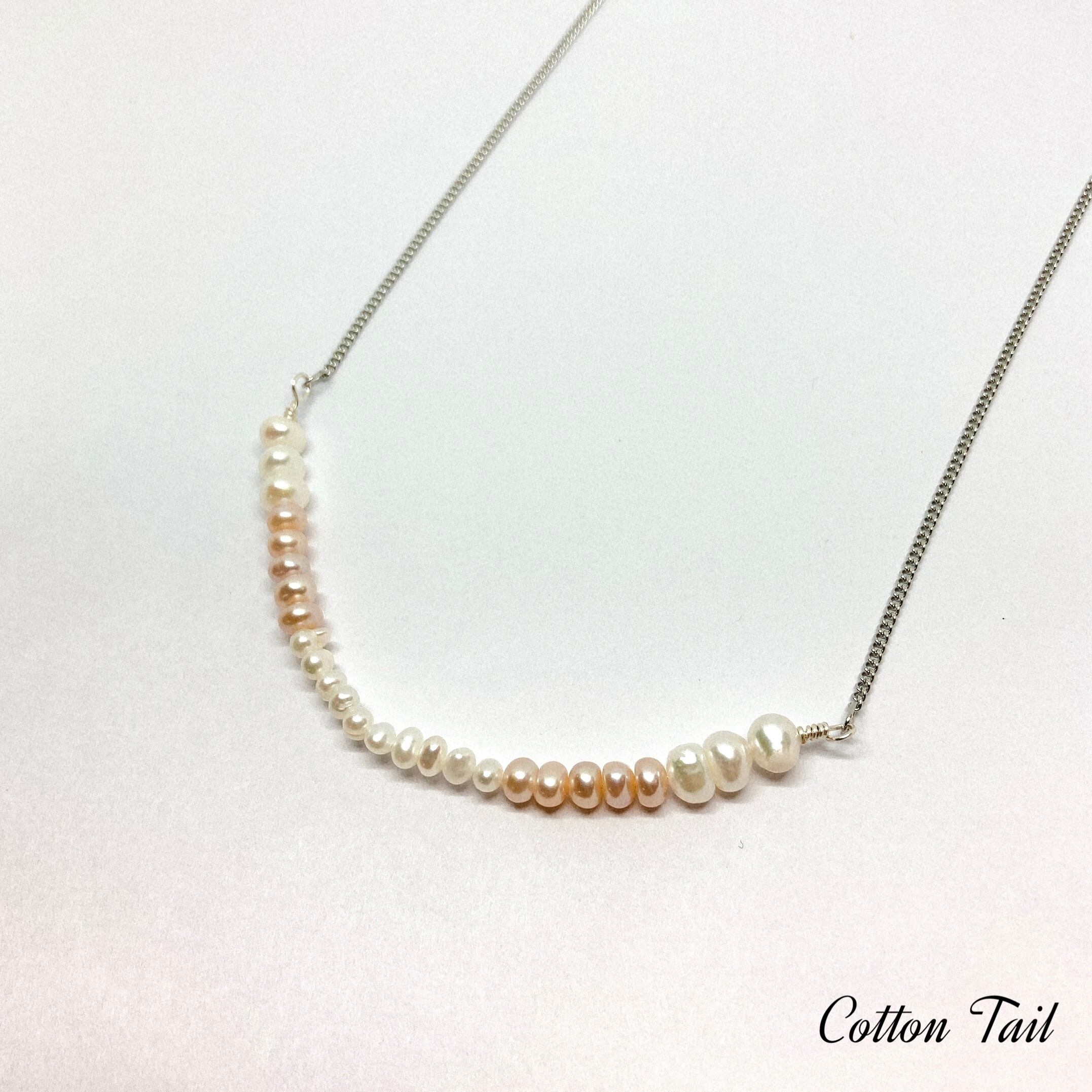 ピンクとホワイトの2色使いで8mm〜3mmの大きさの淡水パールをシルバーのアーティスティックワイヤーに通しサージカルステンレスチェーンを繋いだもので、金属アレルギーの方にも着けていただけるようカン類・引き輪などにもこだわっております。