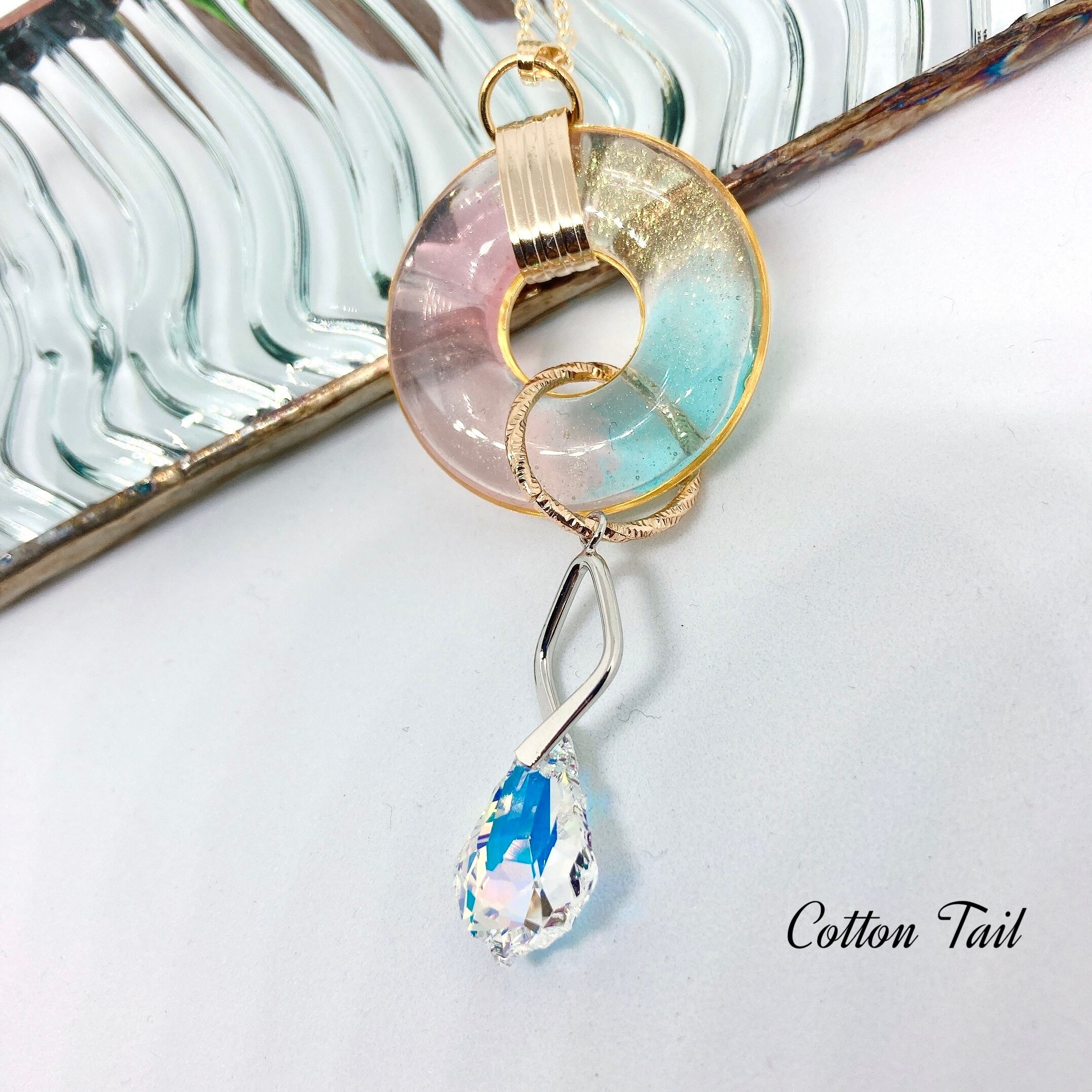 こちらは、30mmと10mmのフープにレジンで虹色に着色したリングとデザインバチカンにスワロフスキークリスタルを付けたネックレスになります。