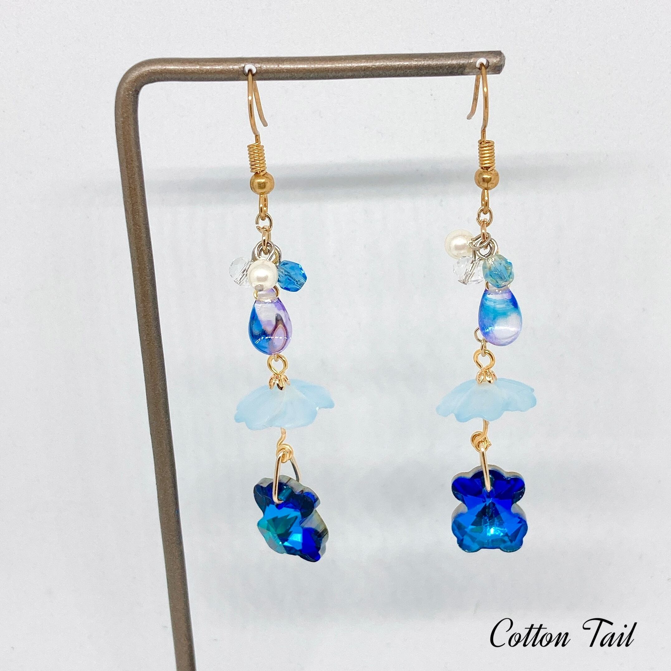 ガラス製クマさんビーズ(ブルー)にドイツ製プラスチックフラワービーズ(ブルー)で傘にし、上部に雨粒として雫ガラスビーズやパールビーズなどを配した、イヤリングとなっております。