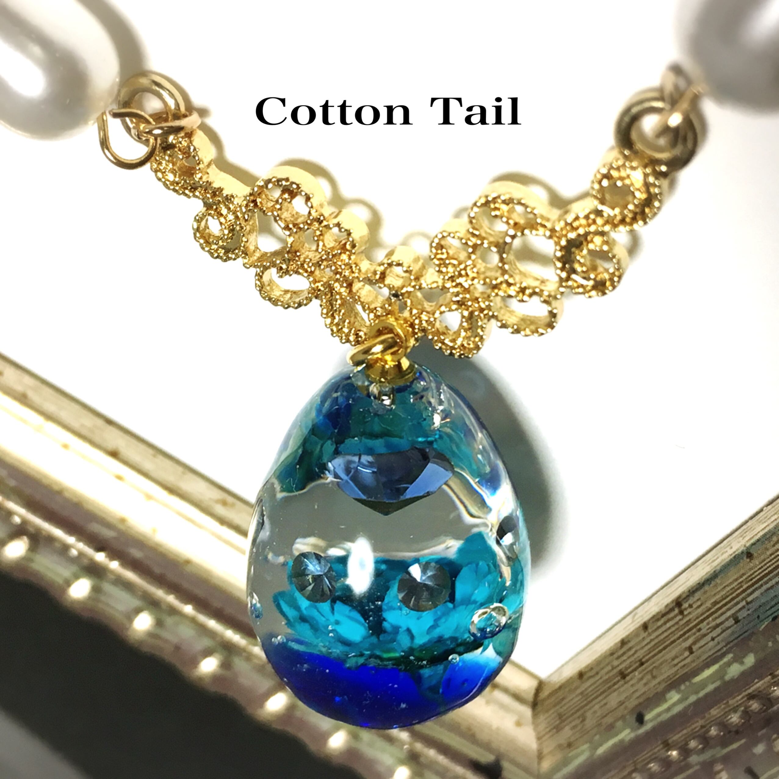 雫形の中にブルー系のカレット、一輪の花、スワロフスキーなどを封入し、フラワーコネクターでゴージャスなネックレスに!