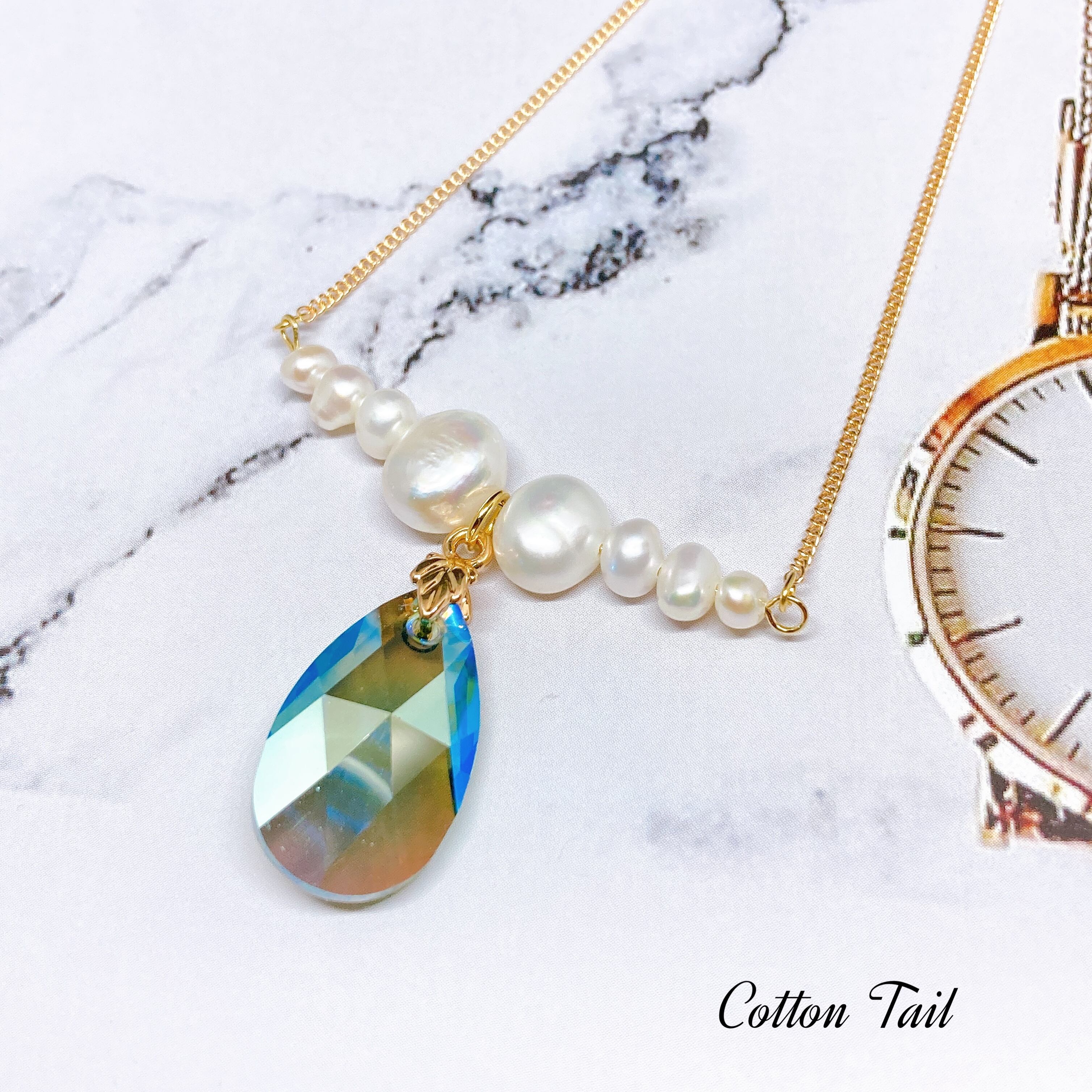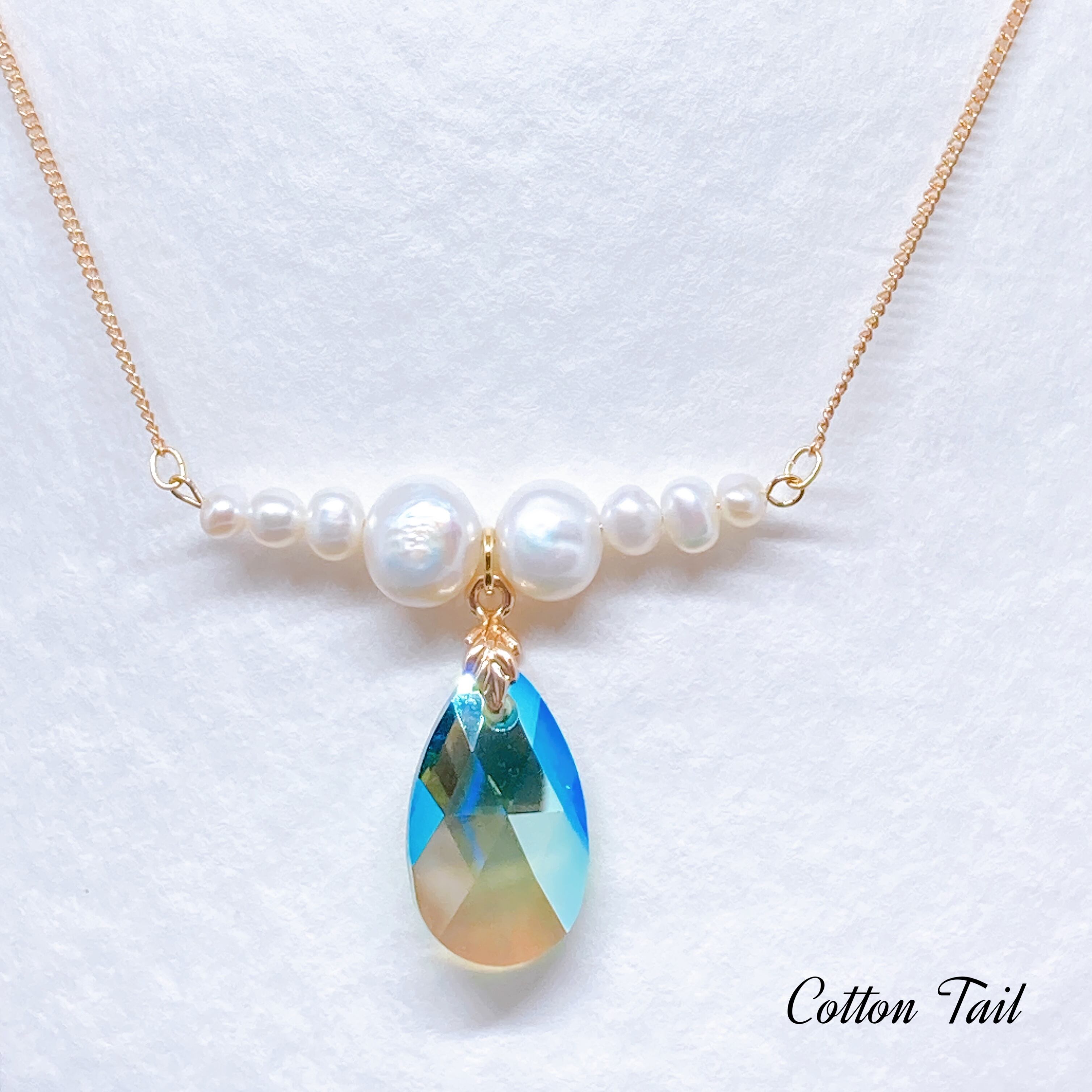 こちらは、色々な大きさの淡水パール(バロック等)とスワロフスキークリスタル(エリナイトシマー)を組み合わせたネックレスです。