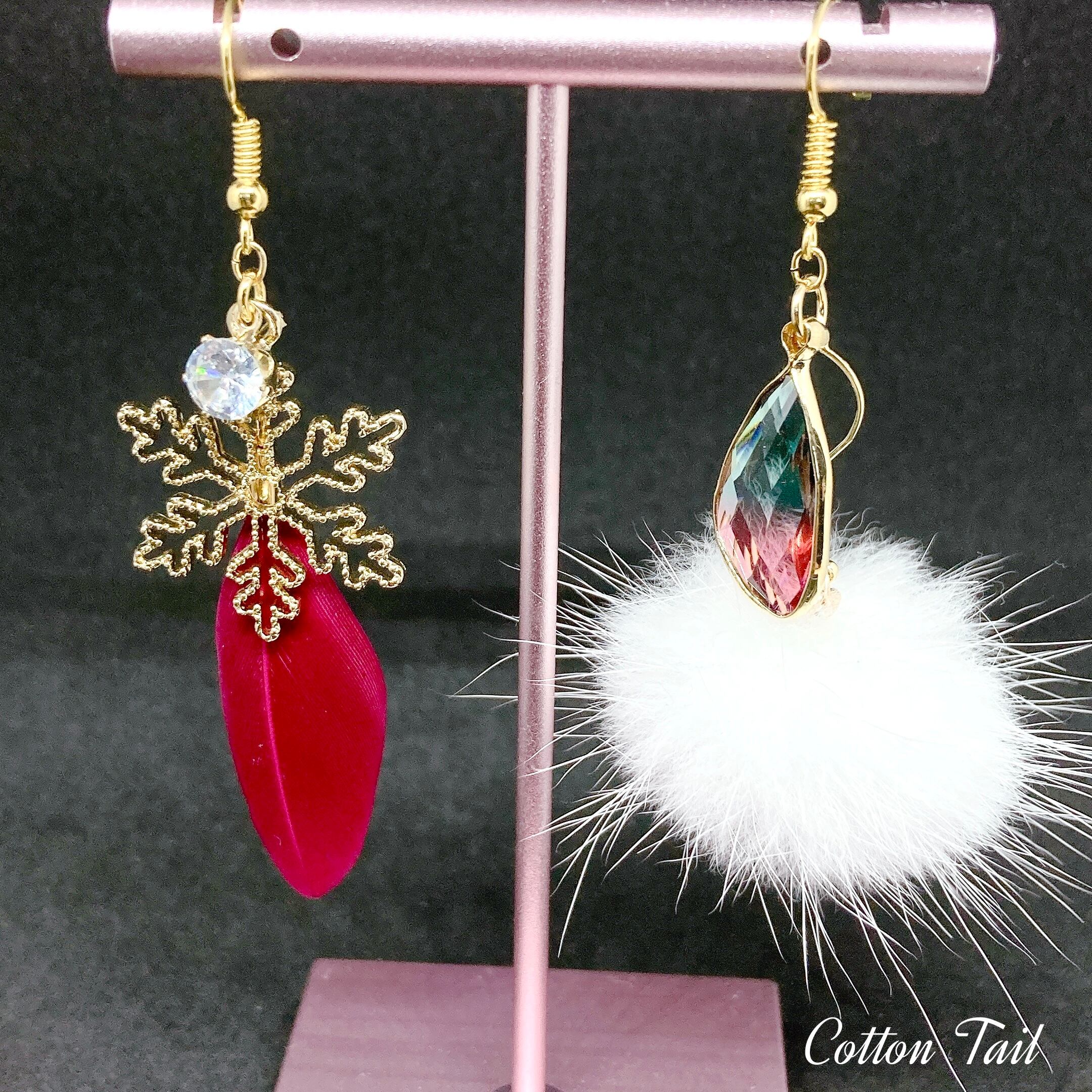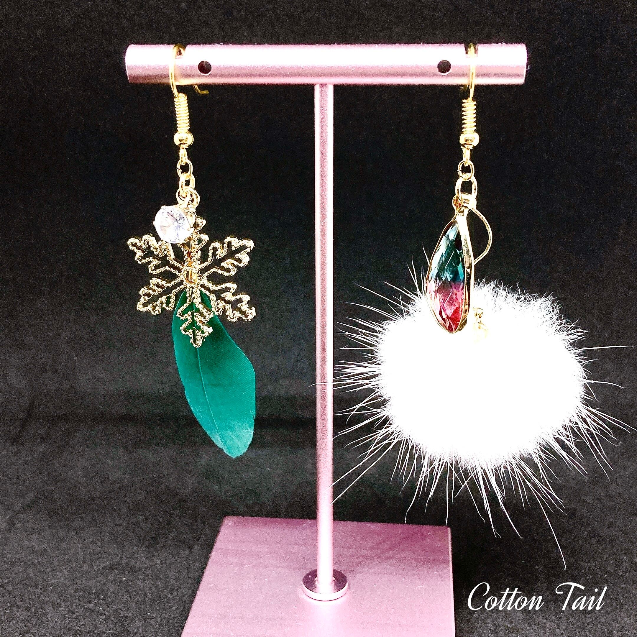 フェザーと雪の結晶チャーム・ジルコニアチャームを合わせたものと、もう一方はミンクファー をチャーム仕様にした物と変形フレームガラスパーツ(ピンク×ブルー)チャームをS字つなぎパーツで繋いだものとで、1ペアのイヤリングにしております。