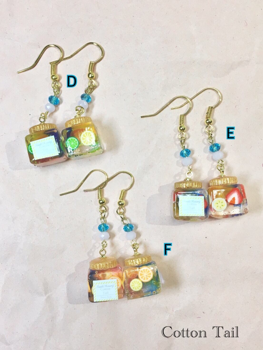 シリコンで型から作ったボトル型のモールドに色々なフルーツを入れカラフルレジンカラーで、見た目も鮮やかなピアス(イヤリング)を作りました。