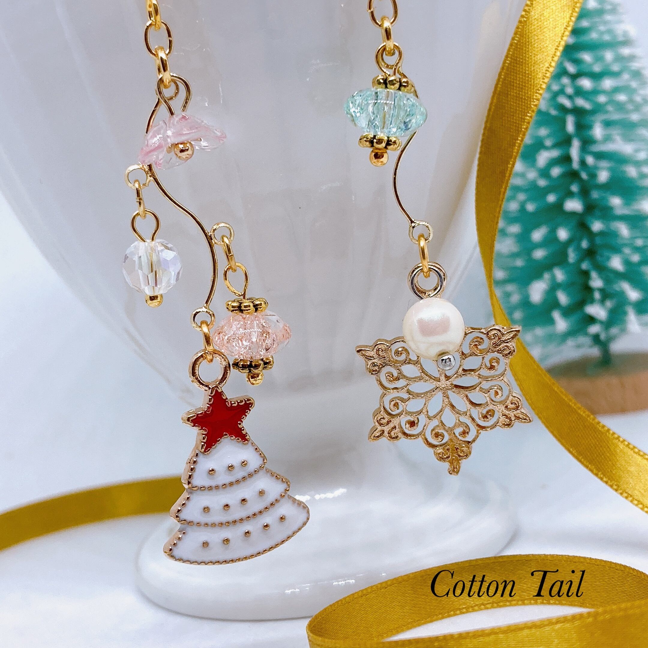 雪の結晶透かしチャームとツリーのチャームにクリスマスムードを盛り上げるカラーのガラスビーズを合わせた気分もウキウキするようなイヤリングに仕立てております。