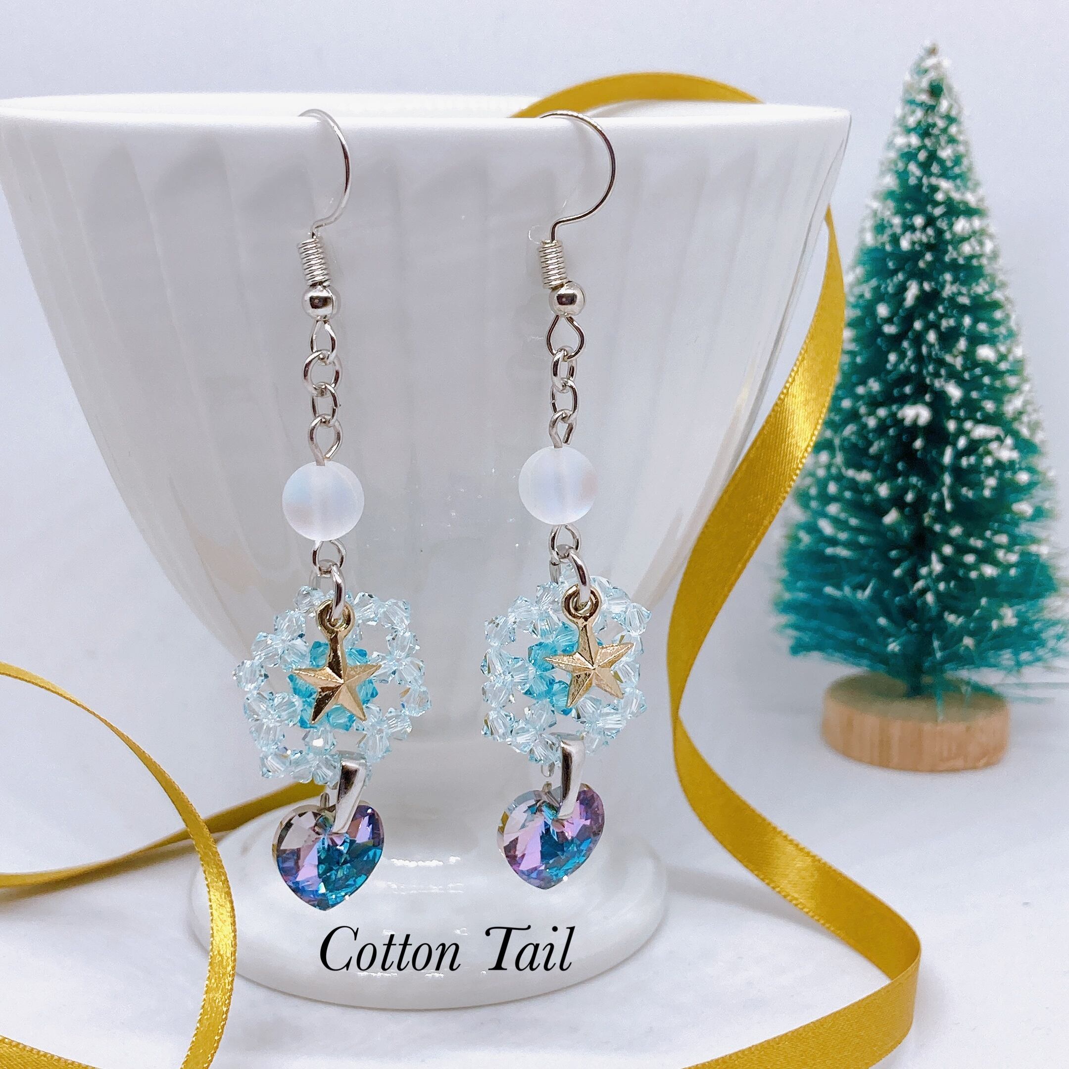 スワロフスキー(ソロバン3mm)で雪の結晶のように編み上げております。