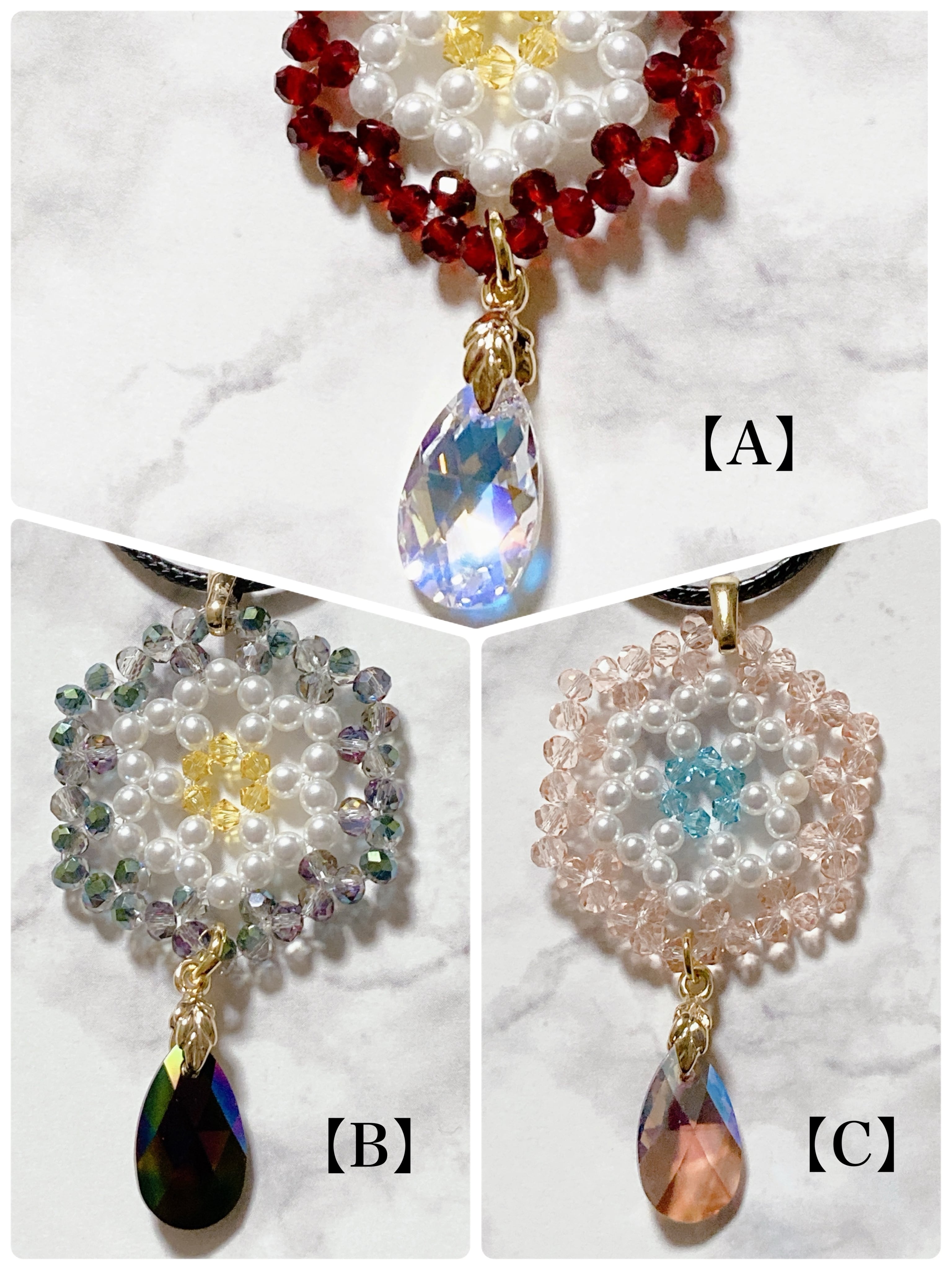 ボタンビーズ・パールビーズ・スワロフスキー(ソロバン)(いずれも3mm)で編んだ六角形とスワロフスキー雫(16×11mm)を合わせたネックレスになります。
