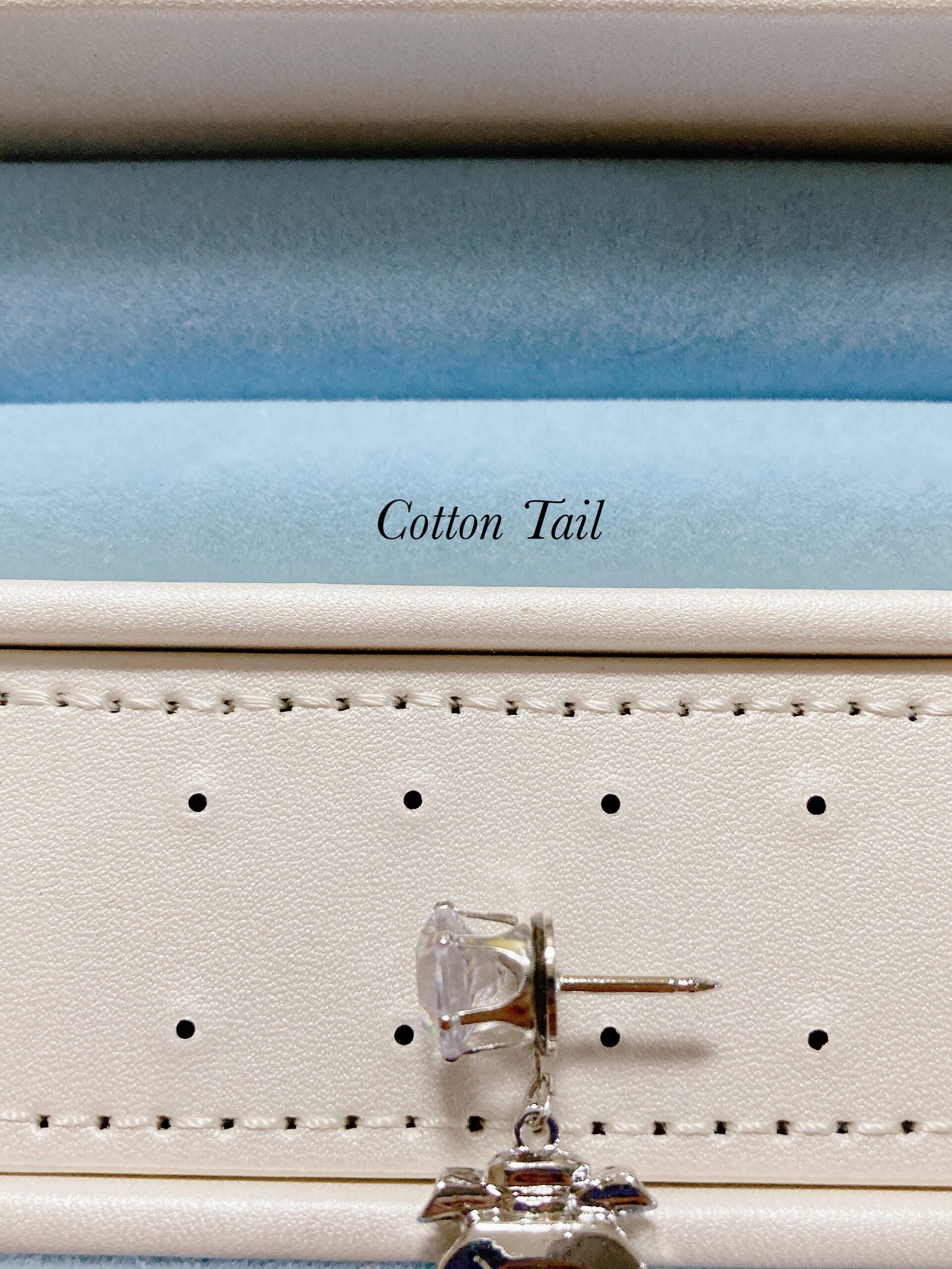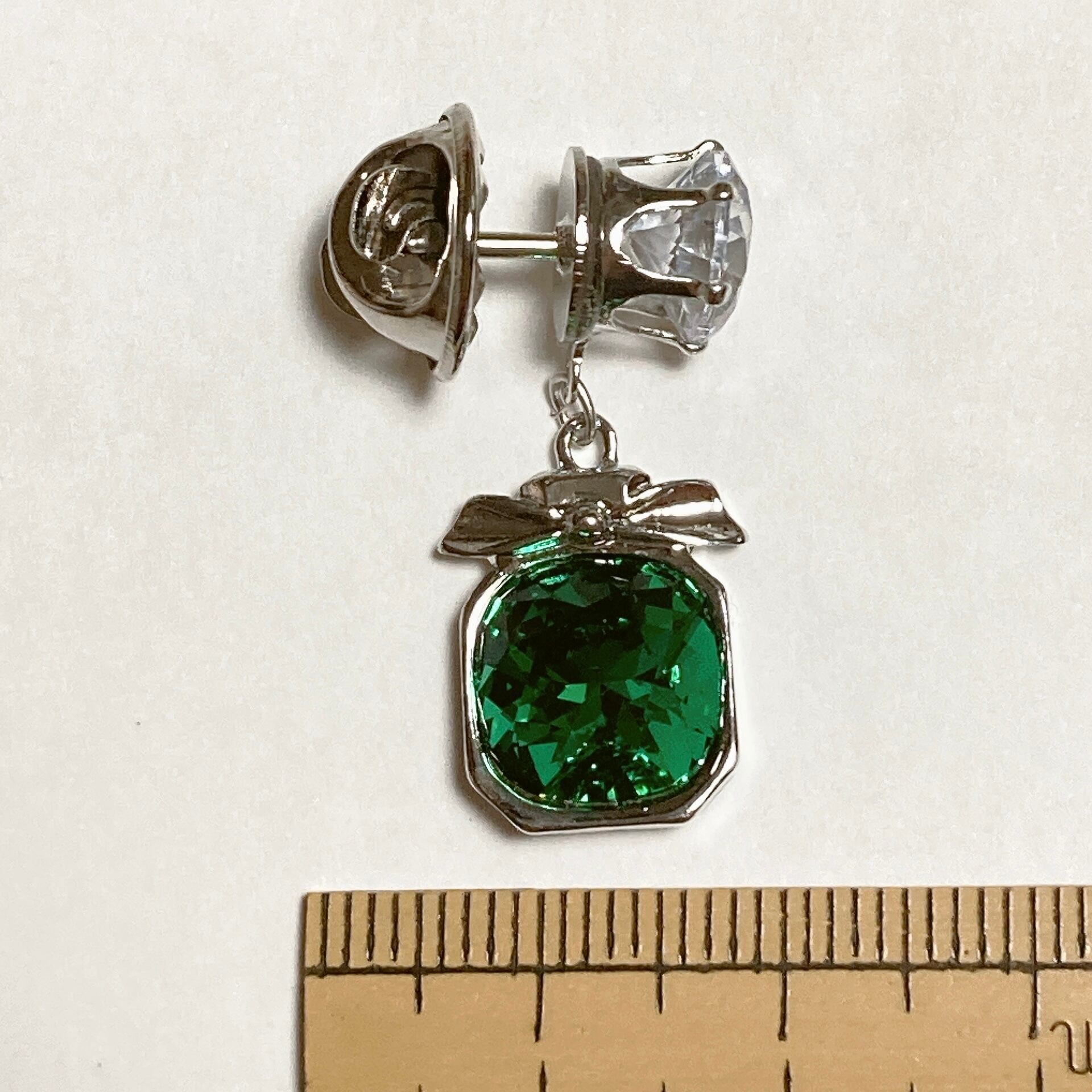 爪付きキュービックジルコニアをピンバッジ台に貼り付け、下にパヒュームボトルチャームを付けたピンバッジです。